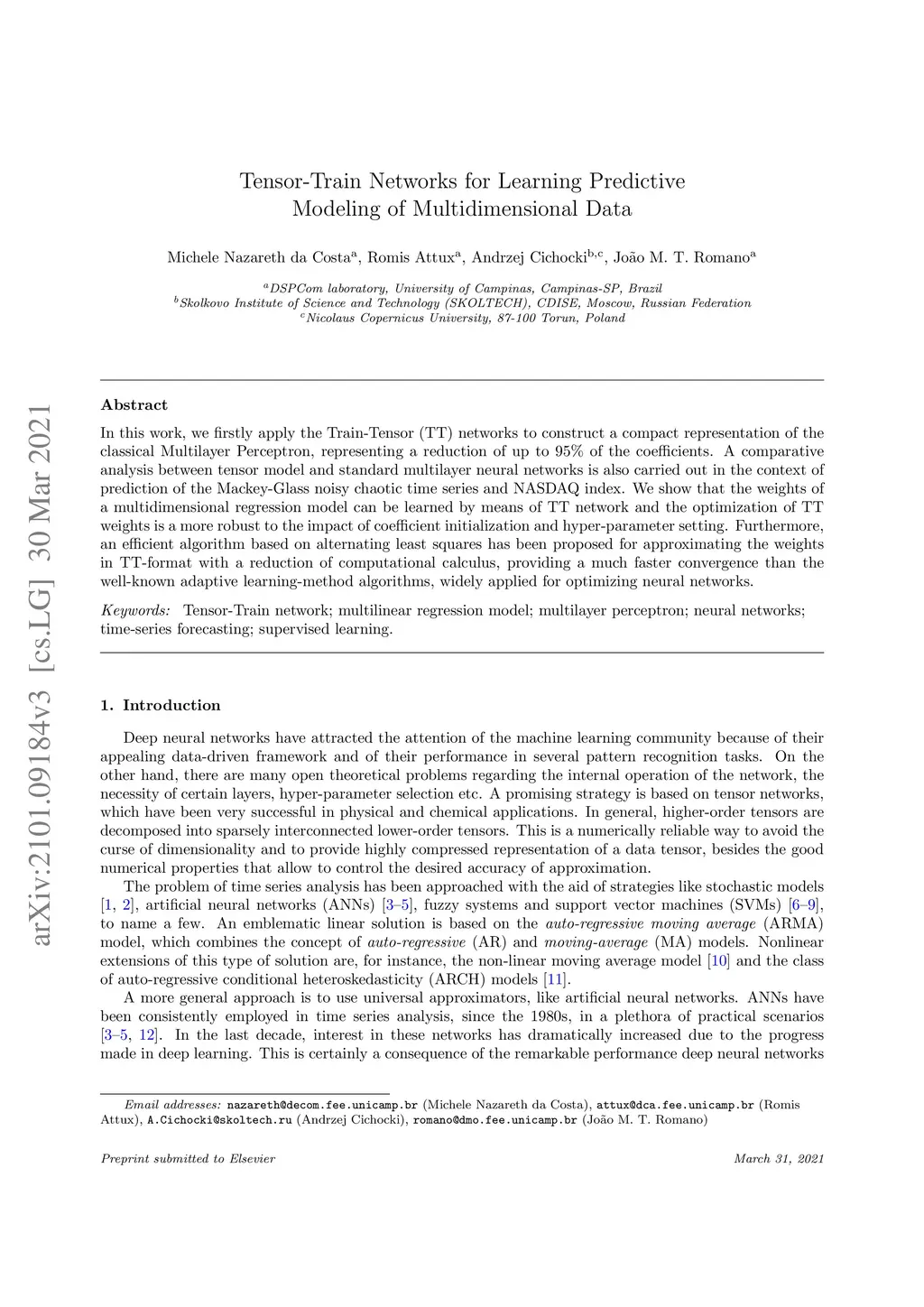 In this work, we firstly apply the Train-Tensor (TT) networks to construct a compact representation of the classical Multilayer Perceptron, representing a reduction of up to 95% of the coefficients. A comparative analysis between tensor model and standard multilayer neural networks is also carried out in the context of prediction of the Mackey-Glass noisy chaotic time series and NASDAQ index. We show that the weights of a multidimensional regression model can be learned by means of TT network and the optimization of TT weights is a more robust to the impact of coefficient initialization and hyper-parameter setting. Furthermore, an efficient algorithm based on alternating least squares has been proposed for approximating the weights in TT-format with a reduction of computational calculus, providing a much faster convergence than the well-known adaptive learning-method algorithms, widely applied for optimizing neural networks.