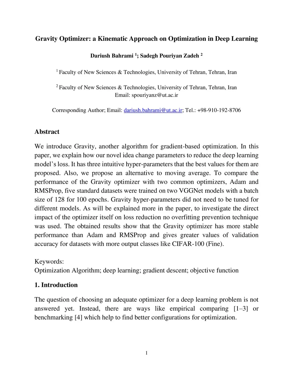 We introduce Gravity, another algorithm for gradient-based optimization. In this paper, we explain how our novel idea change parameters to reduce the deep learning model's loss. It has three intuitive hyper-parameters that the best values for them are proposed. Also, we propose an alternative to moving average. To compare the performance of the Gravity optimizer with two common optimizers, Adam and RMSProp, five standard datasets were trained on two VGGNet models with a batch size of 128 for 100 epochs. Gravity hyper-parameters did not need to be tuned for different models. As will be explained more in the paper, to investigate the direct impact of the optimizer itself on loss reduction no overfitting prevention technique was used. The obtained results show that the Gravity optimizer has more stable performance than Adam and RMSProp and gives greater values of validation accuracy for datasets with more output classes like CIFAR-100 (Fine).
