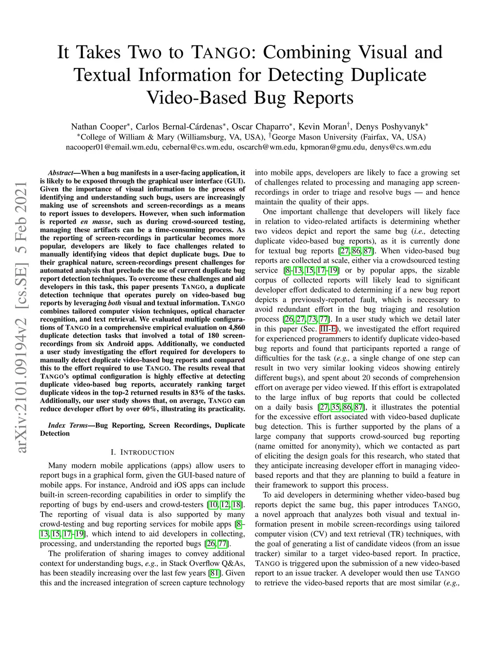 When a bug manifests in a user-facing application, it is likely to be exposed through the graphical user interface (GUI). Given the importance of visual information to the process of identifying and understanding such bugs, users are increasingly making use of screenshots and screen-recordings as a means to report issues to developers. However, when such information is reported en masse, such as during crowd-sourced testing, managing these artifacts can be a time-consuming process. As the reporting of screen-recordings in particular becomes more popular, developers are likely to face challenges related to manually identifying videos that depict duplicate bugs. Due to their graphical nature, screen-recordings present challenges for automated analysis that preclude the use of current duplicate bug report detection techniques. To overcome these challenges and aid developers in this task, this paper presents Tango, a duplicate detection technique that operates purely on video-based bug reports by leveraging both visual and textual information. Tango combines tailored computer vision techniques, optical character recognition, and text retrieval. We evaluated multiple configurations of Tango in a comprehensive empirical evaluation on 4,860 duplicate detection tasks that involved a total of 180 screen-recordings from six Android apps. Additionally, we conducted a user study investigating the effort required for developers to manually detect duplicate video-based bug reports and compared this to the effort required to use Tango. The results reveal that Tango's optimal configuration is highly effective at detecting duplicate video-based bug reports, accurately ranking target duplicate videos in the top-2 returned results in 83% of the tasks. Additionally, our user study shows that, on average, Tango can reduce developer effort by over 60%, illustrating its practicality.