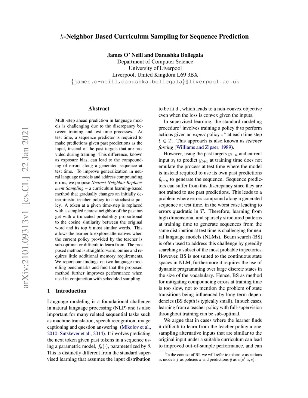 Multi-step ahead prediction in language models is challenging due to the discrepancy between training and test time processes. At test time, a sequence predictor is required to make predictions given past predictions as the input, instead of the past targets that are provided during training. This difference, known as exposure bias, can lead to the compounding of errors along a generated sequence at test time. To improve generalization in neural language models and address compounding errors, we propose \textit{Nearest-Neighbor Replacement Sampling} -- a curriculum learning-based method that gradually changes an initially deterministic teacher policy to a stochastic policy. A token at a given time-step is replaced with a sampled nearest neighbor of the past target with a truncated probability proportional to the cosine similarity between the original word and its top most similar words. This allows the learner to explore alternatives when the current policy provided by the teacher is sub-optimal or difficult to learn from. The proposed method is straightforward, online and requires little additional memory requirements. We report our findings on two language modelling benchmarks and find that the proposed method further improves performance when used in conjunction with scheduled sampling.