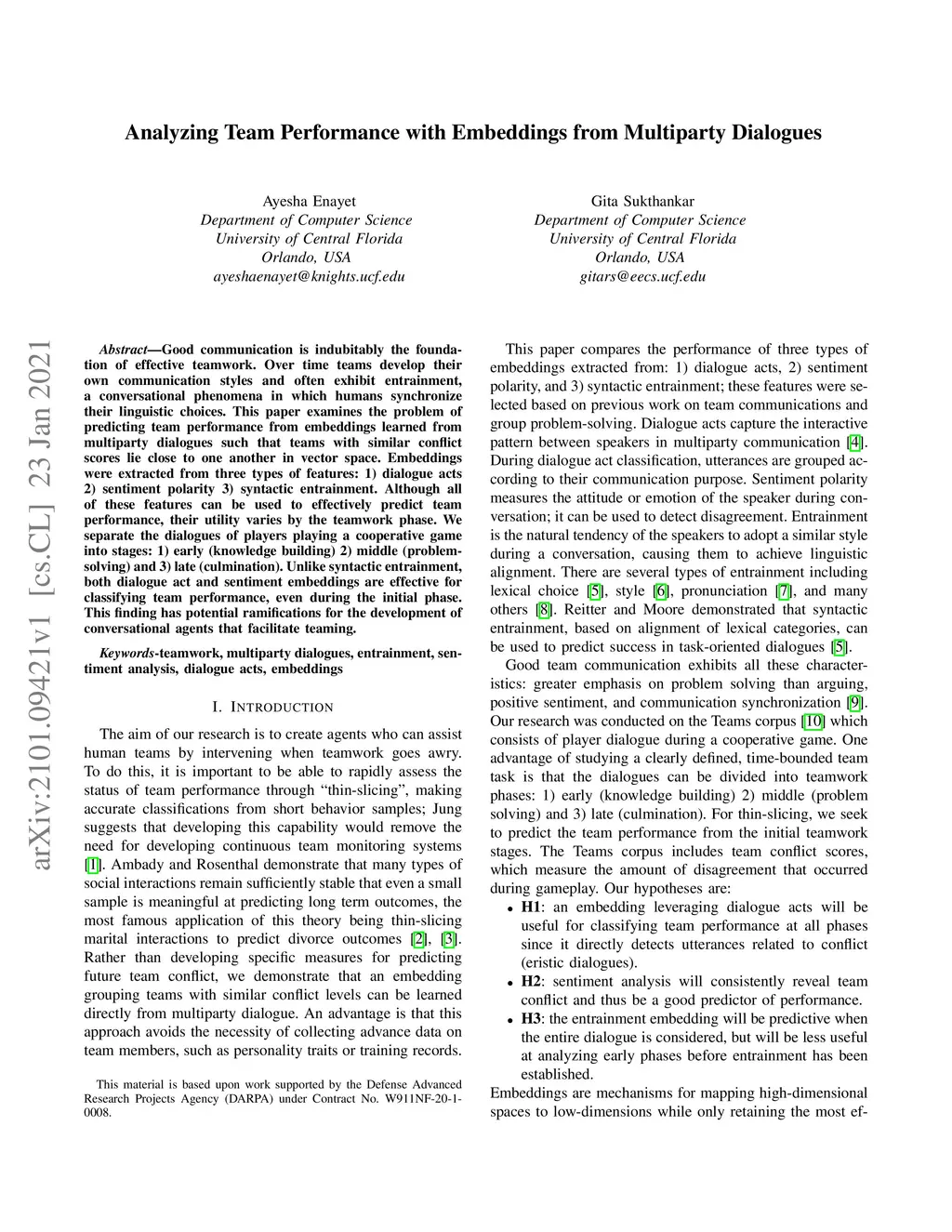 Analyzing Team Performance with Embeddings from Multiparty Dialogues