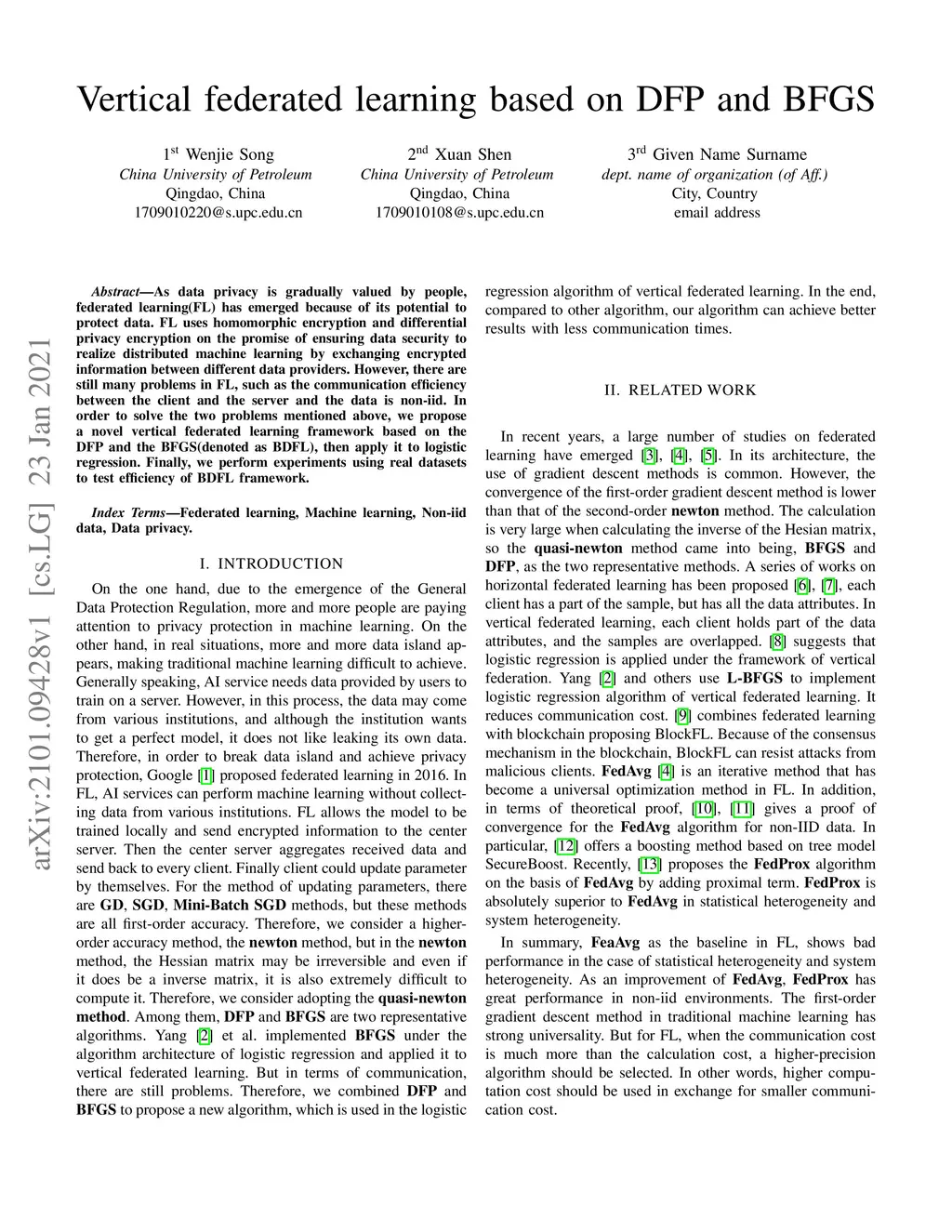 As data privacy is gradually valued by people, federated learning(FL) has emerged because of its potential to protect data. FL uses homomorphic encryption and differential privacy encryption on the promise of ensuring data security to realize distributed machine learning by exchanging encrypted information between different data providers. However, there are still many problems in FL, such as the communication efficiency between the client and the server and the data is non-iid. In order to solve the two problems mentioned above, we propose a novel vertical federated learning framework based on the DFP and the BFGS(denoted as BDFL), then apply it to logistic regression. Finally, we perform experiments using real datasets to test efficiency of BDFL framework.