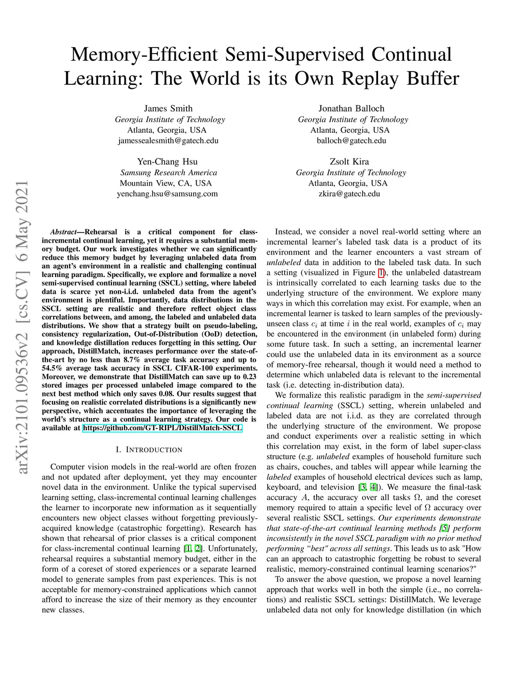 Rehearsal is a critical component for class-incremental continual learning, yet it requires a substantial memory budget. Our work investigates whether we can significantly reduce this memory budget by leveraging unlabeled data from an agent's environment in a realistic and challenging continual learning paradigm. Specifically, we explore and formalize a novel semi-supervised continual learning (SSCL) setting, where labeled data is scarce yet non-i.i.d. unlabeled data from the agent's environment is plentiful. Importantly, data distributions in the SSCL setting are realistic and therefore reflect object class correlations between, and among, the labeled and unlabeled data distributions. We show that a strategy built on pseudo-labeling, consistency regularization, Out-of-Distribution (OoD) detection, and knowledge distillation reduces forgetting in this setting. Our approach, DistillMatch, increases performance over the state-of-the-art by no less than 8.7% average task accuracy and up to 54.5% average task accuracy in SSCL CIFAR-100 experiments. Moreover, we demonstrate that DistillMatch can save up to 0.23 stored images per processed unlabeled image compared to the next best method which only saves 0.08. Our results suggest that focusing on realistic correlated distributions is a significantly new perspective, which accentuates the importance of leveraging the world's structure as a continual learning strategy.