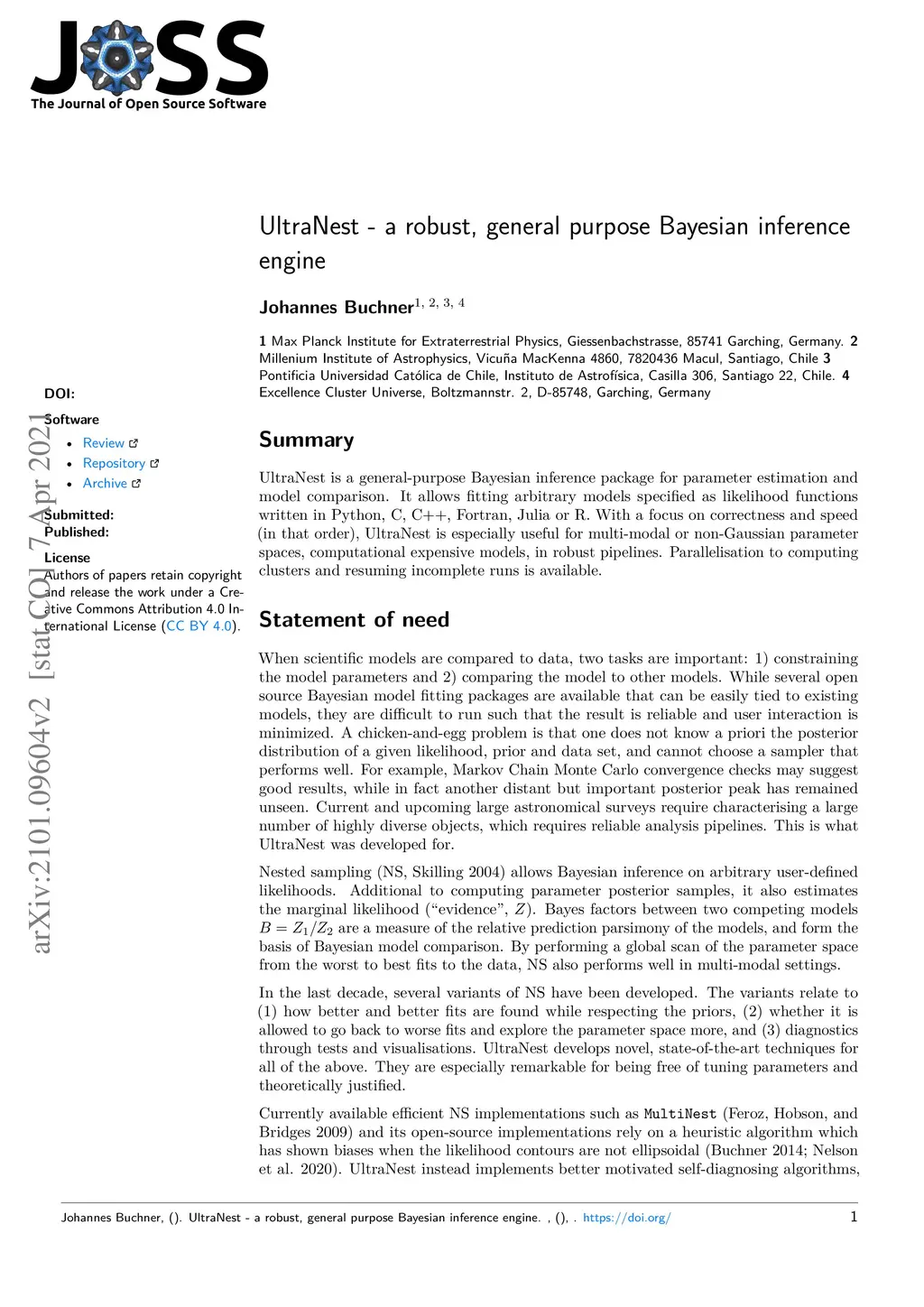 UltraNest is a general-purpose Bayesian inference package for parameter estimation and model comparison. It allows fitting arbitrary models specified as likelihood functions written in Python, C, C++, Fortran, Julia or R. With a focus on correctness and speed (in that order), UltraNest is especially useful for multi-modal or non-Gaussian parameter spaces, computational expensive models, in robust pipelines. Parallelisation to computing clusters and resuming incomplete runs is available.