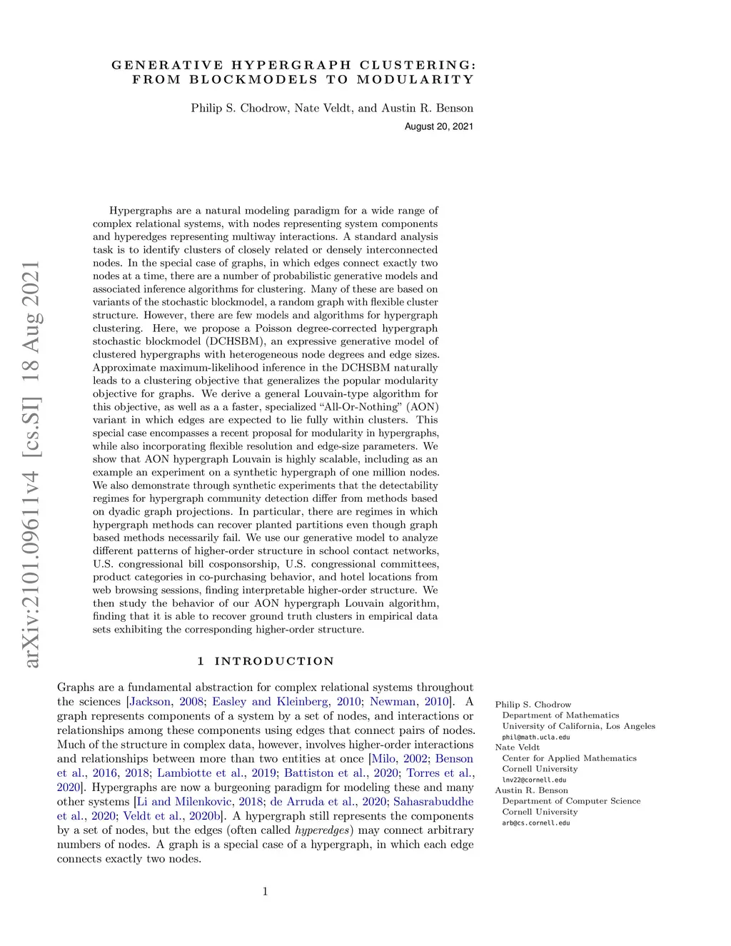 Hypergraphs are a natural modeling paradigm for a wide range of complex relational systems. A standard analysis task is to identify clusters of closely related or densely interconnected nodes. Many graph algorithms for this task are based on variants of the stochastic blockmodel, a random graph with flexible cluster structure. However, there are few models and algorithms for hypergraph clustering. Here, we propose a Poisson degree-corrected hypergraph stochastic blockmodel (DCHSBM), a generative model of clustered hypergraphs with heterogeneous node degrees and edge sizes. Approximate maximum-likelihood inference in the DCHSBM naturally leads to a clustering objective that generalizes the popular modularity objective for graphs. We derive a general Louvain-type algorithm for this objective, as well as a a faster, specialized "All-Or-Nothing" (AON) variant in which edges are expected to lie fully within clusters. This special case encompasses a recent proposal for modularity in hypergraphs, while also incorporating flexible resolution and edge-size parameters. We show that AON hypergraph Louvain is highly scalable, including as an example an experiment on a synthetic hypergraph of one million nodes. We also demonstrate through synthetic experiments that the detectability regimes for hypergraph community detection differ from methods based on dyadic graph projections. We use our generative model to analyze different patterns of higher-order structure in school contact networks, U.S. congressional bill cosponsorship, U.S. congressional committees, product categories in co-purchasing behavior, and hotel locations from web browsing sessions, finding interpretable higher-order structure. We then study the behavior of our AON hypergraph Louvain algorithm, finding that it is able to recover ground truth clusters in empirical data sets exhibiting the corresponding higher-order structure.