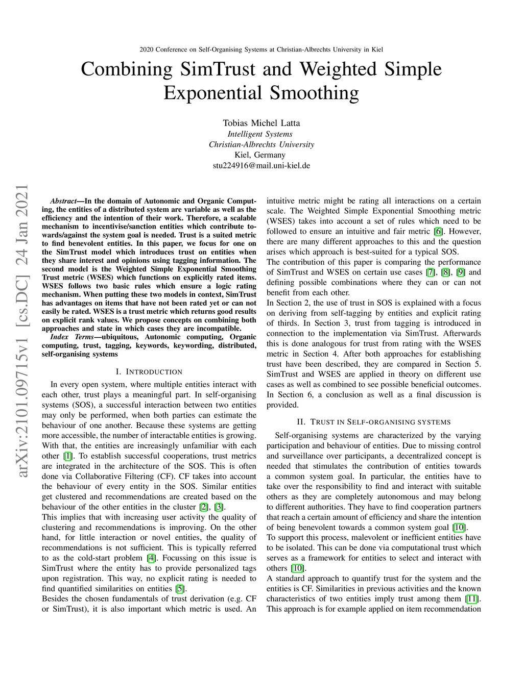In the domain of Autonomic and Organic Computing, the entities of a distributed system are variable as well as the efficiency and the intention of their work. Therefore, a scalable mechanism to incentivise/sanction entities which contribute towards/against the system goal is needed. Trust is a suited metric to find benevolent entities. In this paper, we focus for one on the SimTrust model which introduces trust on entities when they share interest and opinions using tagging information. The second model is the Weighted Simple Exponential Smoothing Trust metric (WSES) which functions on explicitly rated items. WSES follows two basic rules which ensure a logic rating mechanism. When putting these two models in context, SimTrust has advantages on items that have not been rated yet or can not easily be rated. WSES is a trust metric which returns good results on explicit rank values. We propose concepts on combining both approaches and state in which cases they are incompatible.