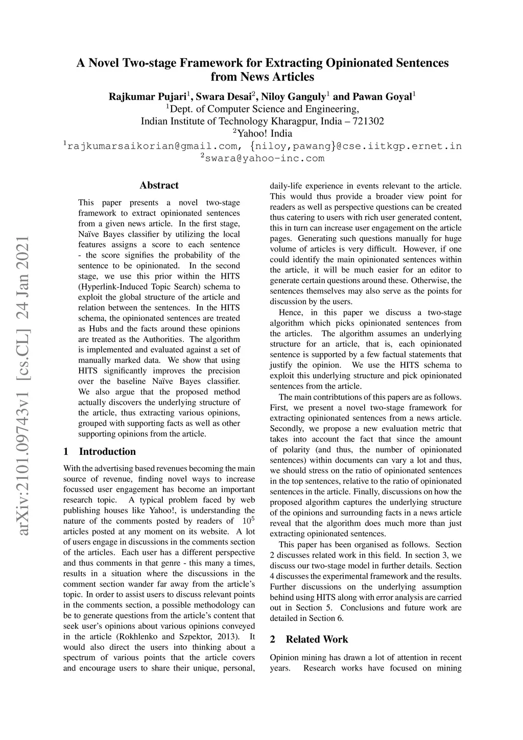 This paper presents a novel two-stage framework to extract opinionated sentences from a given news article. In the first stage, Naive Bayes classifier by utilizing the local features assigns a score to each sentence - the score signifies the probability of the sentence to be opinionated. In the second stage, we use this prior within the HITS (Hyperlink-Induced Topic Search) schema to exploit the global structure of the article and relation between the sentences. In the HITS schema, the opinionated sentences are treated as Hubs and the facts around these opinions are treated as the Authorities. The algorithm is implemented and evaluated against a set of manually marked data. We show that using HITS significantly improves the precision over the baseline Naive Bayes classifier. We also argue that the proposed method actually discovers the underlying structure of the article, thus extracting various opinions, grouped with supporting facts as well as other supporting opinions from the article.