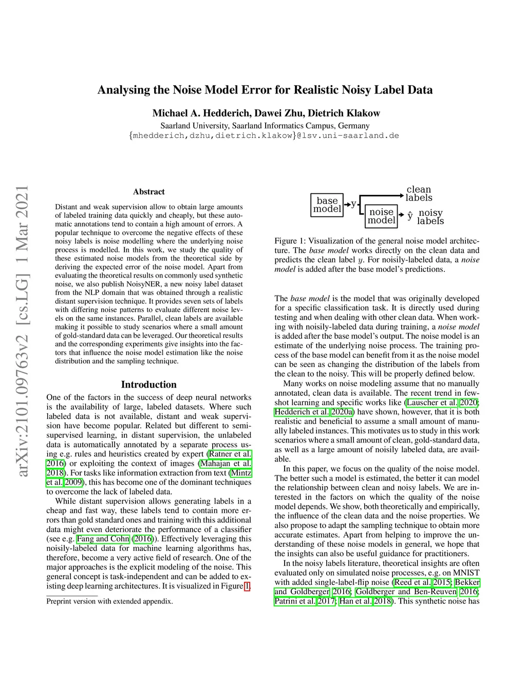 Distant and weak supervision allow to obtain large amounts of labeled training data quickly and cheaply, but these automatic annotations tend to contain a high amount of errors. A popular technique to overcome the negative effects of these noisy labels is noise modelling where the underlying noise process is modelled. In this work, we study the quality of these estimated noise models from the theoretical side by deriving the expected error of the noise model. Apart from evaluating the theoretical results on commonly used synthetic noise, we also publish NoisyNER, a new noisy label dataset from the NLP domain that was obtained through a realistic distant supervision technique. It provides seven sets of labels with differing noise patterns to evaluate different noise levels on the same instances. Parallel, clean labels are available making it possible to study scenarios where a small amount of gold-standard data can be leveraged. Our theoretical results and the corresponding experiments give insights into the factors that influence the noise model estimation like the noise distribution and the sampling technique.