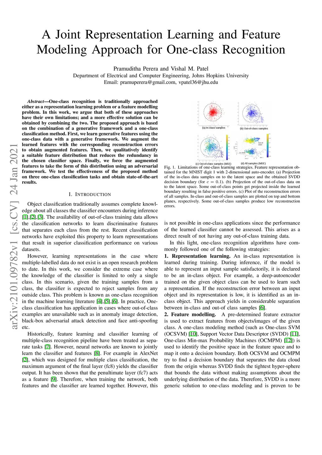 One-class recognition is traditionally approached either as a representation learning problem or a feature modeling problem. In this work, we argue that both of these approaches have their own limitations; and a more effective solution can be obtained by combining the two. The proposed approach is based on the combination of a generative framework and a one-class classification method. First, we learn generative features using the one-class data with a generative framework. We augment the learned features with the corresponding reconstruction errors to obtain augmented features. Then, we qualitatively identify a suitable feature distribution that reduces the redundancy in the chosen classifier space. Finally, we force the augmented features to take the form of this distribution using an adversarial framework. We test the effectiveness of the proposed method on three one-class classification tasks and obtain state-of-the-art results.