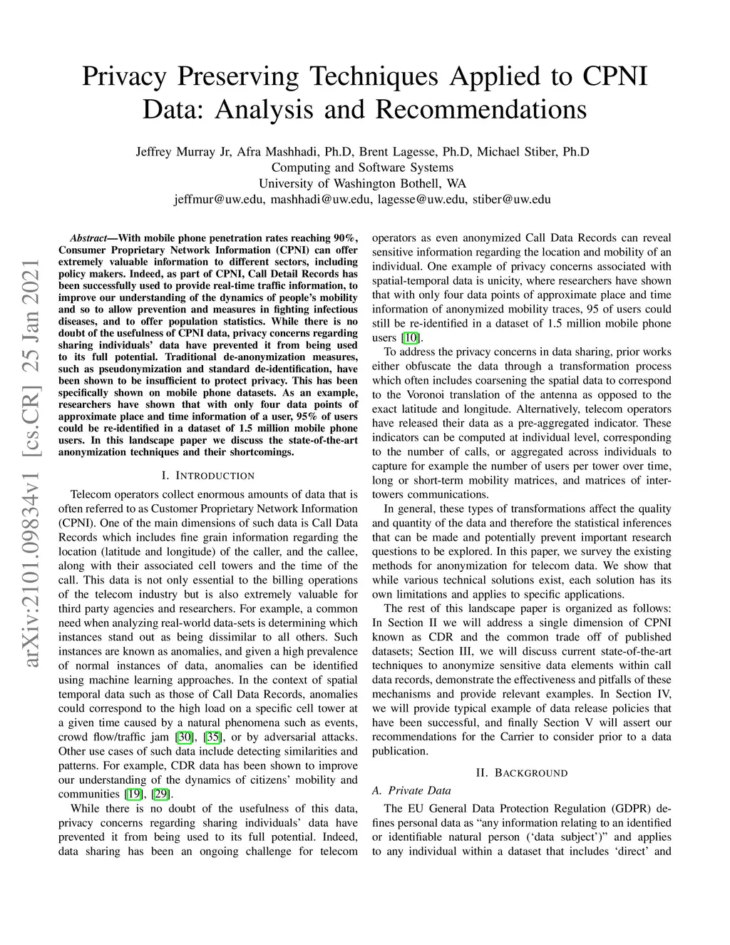 Privacy Preserving Techniques Applied to CPNI Data: Analysis and