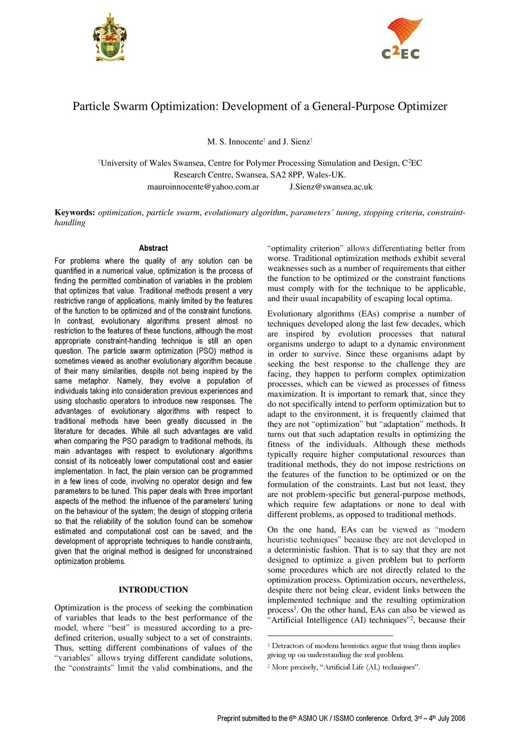 Traditional methods present a very restrictive range of applications, mainly limited by the features of the function to be optimized and of the constraint functions. In contrast, evolutionary algorithms present almost no restriction to the features of these functions, although the most appropriate constraint-handling technique is still an open question. The particle swarm optimization (PSO) method is sometimes viewed as another evolutionary algorithm because of their many similarities, despite not being inspired by the same metaphor. Namely, they evolve a population of individuals taking into consideration previous experiences and using stochastic operators to introduce new responses. The advantages of evolutionary algorithms with respect to traditional methods have been greatly discussed in the literature for decades. While all such advantages are valid when comparing the PSO paradigm to traditional methods, its main advantages with respect to evolutionary algorithms consist of its noticeably lower computational cost and easier implementation. In fact, the plain version can be programmed in a few lines of code, involving no operator design and few parameters to be tuned. This paper deals with three important aspects of the method: the influence of the parameters' tuning on the behaviour of the system; the design of stopping criteria so that the reliability of the solution found can be somehow estimated and computational cost can be saved; and the development of appropriate techniques to handle constraints, given that the original method is designed for unconstrained optimization problems.