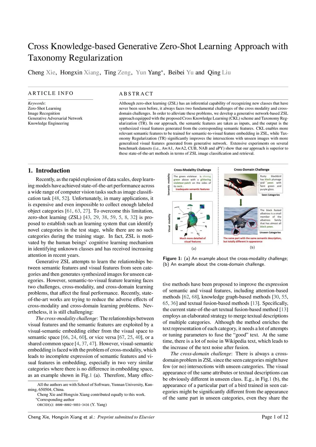 Although zero-shot learning (ZSL) has an inferential capability of recognizing new classes that have never been seen before, it always faces two fundamental challenges of the cross modality and crossdomain challenges. In order to alleviate these problems, we develop a generative network-based ZSL approach equipped with the proposed Cross Knowledge Learning (CKL) scheme and Taxonomy Regularization (TR). In our approach, the semantic features are taken as inputs, and the output is the synthesized visual features generated from the corresponding semantic features. CKL enables more relevant semantic features to be trained for semantic-to-visual feature embedding in ZSL, while Taxonomy Regularization (TR) significantly improves the intersections with unseen images with more generalized visual features generated from generative network. Extensive experiments on several benchmark datasets (i.e., AwA1, AwA2, CUB, NAB and aPY) show that our approach is superior to these state-of-the-art methods in terms of ZSL image classification and retrieval.