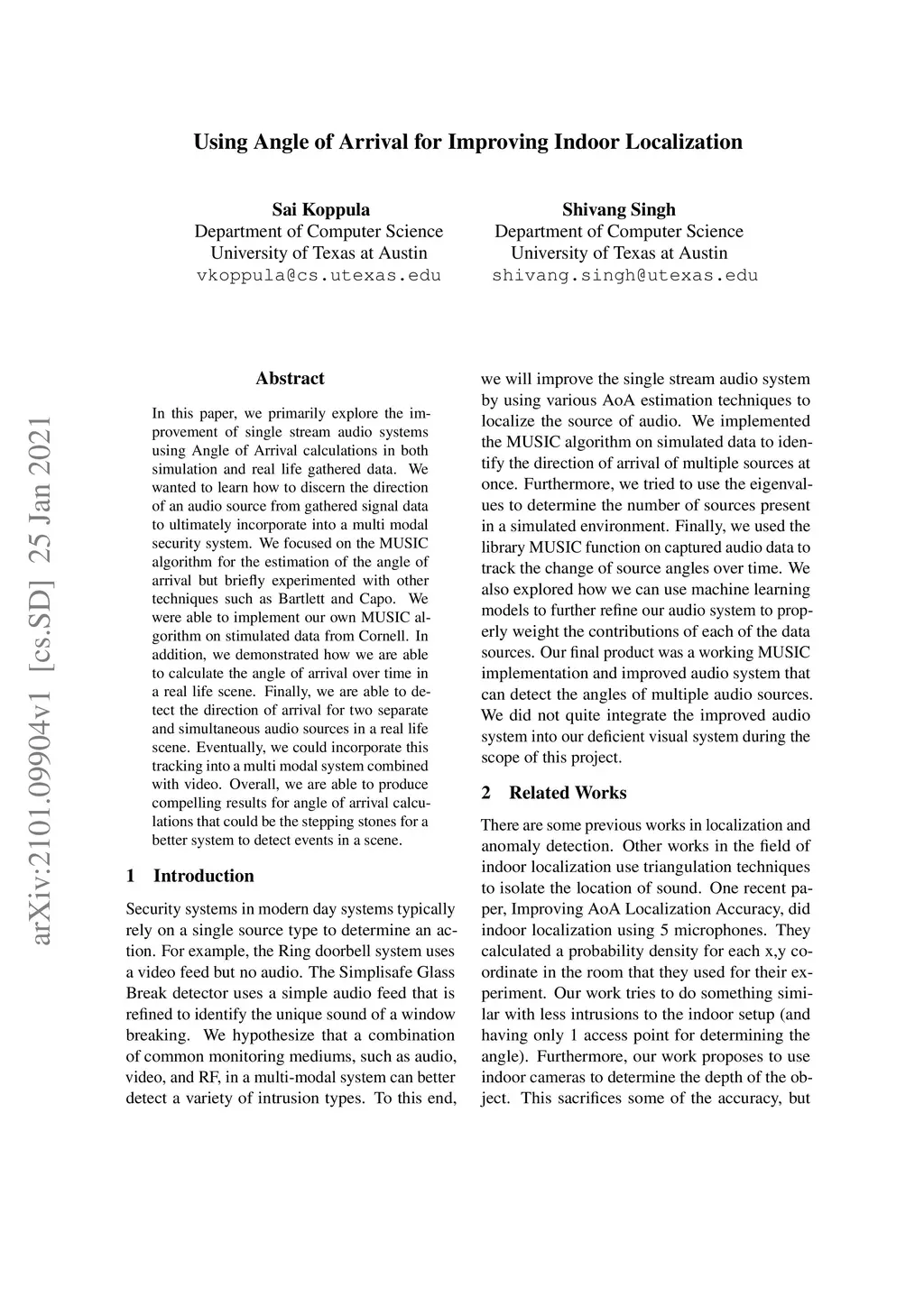 In this paper, we primarily explore the improvement of single stream audio systems using Angle of Arrival calculations in both simulation and real life gathered data. We wanted to learn how to discern the direction of an audio source from gathered signal data to ultimately incorporate into a multi modal security system. We focused on the MUSIC algorithm for the estimation of the angle of arrival but briefly experimented with other techniques such as Bartlett and Capo. We were able to implement our own MUSIC algorithm on stimulated data from Cornell. In addition, we demonstrated how we are able to calculate the angle of arrival over time in a real life scene. Finally, we are able to detect the direction of arrival for two separate and simultaneous audio sources in a real life scene. Eventually, we could incorporate this tracking into a multi modal system combined with video. Overall, we are able to produce compelling results for angle of arrival calculations that could be the stepping stones for a better system to detect events in a scene.