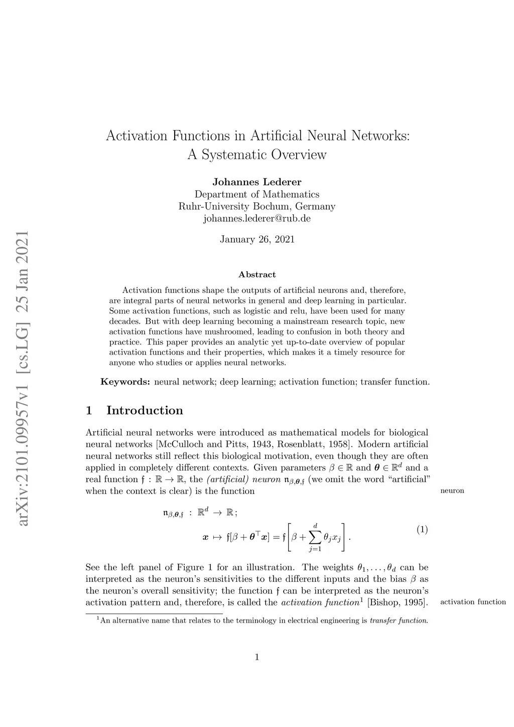 Activation functions shape the outputs of artificial neurons and, therefore, are integral parts of neural networks in general and deep learning in particular. Some activation functions, such as logistic and relu, have been used for many decades. But with deep learning becoming a mainstream research topic, new activation functions have mushroomed, leading to confusion in both theory and practice. This paper provides an analytic yet up-to-date overview of popular activation functions and their properties, which makes it a timely resource for anyone who studies or applies neural networks.