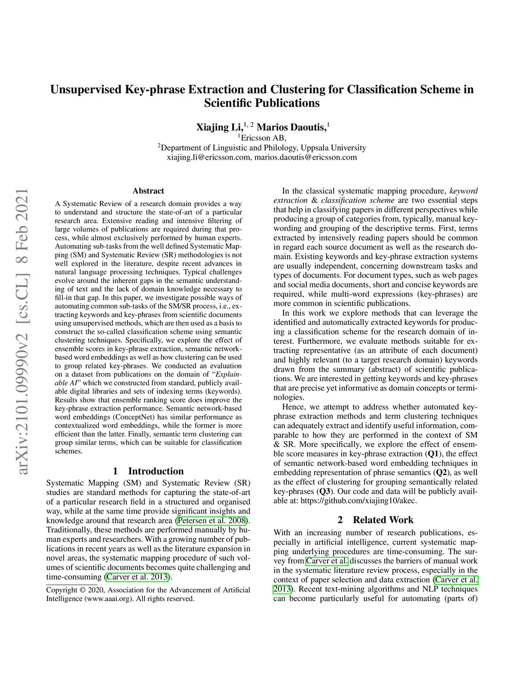 Several methods have been explored for automating parts of Systematic Mapping (SM) and Systematic Review (SR) methodologies. Challenges typically evolve around the gaps in semantic understanding of text, as well as lack of domain and background knowledge necessary to bridge that gap. In this paper we investigate possible ways of automating parts of the SM/SR process, i.e. that of extracting keywords and key-phrases from scientific documents using unsupervised methods, which are then used as a basis to construct the corresponding Classification Scheme using semantic key-phrase clustering techniques. Specifically, we explore the effect of ensemble scores measure in key-phrase extraction, we explore semantic network based word embedding in embedding representation of phrase semantics and finally we also explore how clustering can be used to group related key-phrases. The evaluation is conducted on a dataset of publications pertaining the domain of "Explainable AI" which we constructed using standard publicly available digital libraries and sets of indexing terms (keywords). Results shows that: ensemble ranking score does improve the key-phrase extraction performance. Semantic-network based word embedding based on the ConceptNet Semantic Network has similar performance with contextualized word embedding, however the former are computationally more efficient. Finally Semantic key-phrase clustering at term-level can group similar terms together that can be suitable for classification scheme.