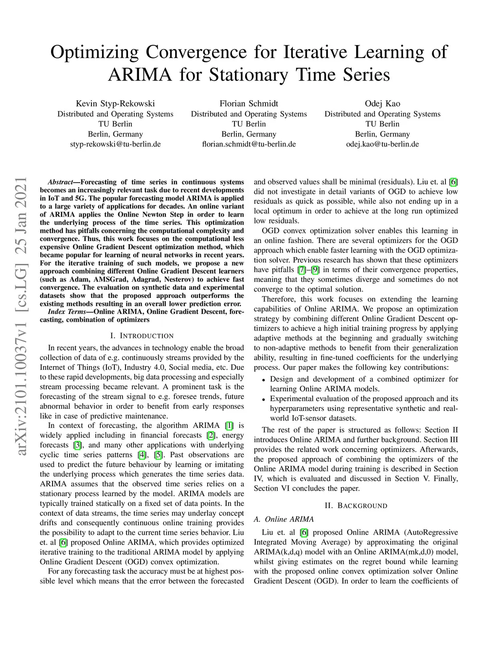Forecasting of time series in continuous systems becomes an increasingly relevant task due to recent developments in IoT and 5G. The popular forecasting model ARIMA is applied to a large variety of applications for decades. An online variant of ARIMA applies the Online Newton Step in order to learn the underlying process of the time series. This optimization method has pitfalls concerning the computational complexity and convergence. Thus, this work focuses on the computational less expensive Online Gradient Descent optimization method, which became popular for learning of neural networks in recent years. For the iterative training of such models, we propose a new approach combining different Online Gradient Descent learners (such as Adam, AMSGrad, Adagrad, Nesterov) to achieve fast convergence. The evaluation on synthetic data and experimental datasets show that the proposed approach outperforms the existing methods resulting in an overall lower prediction error.