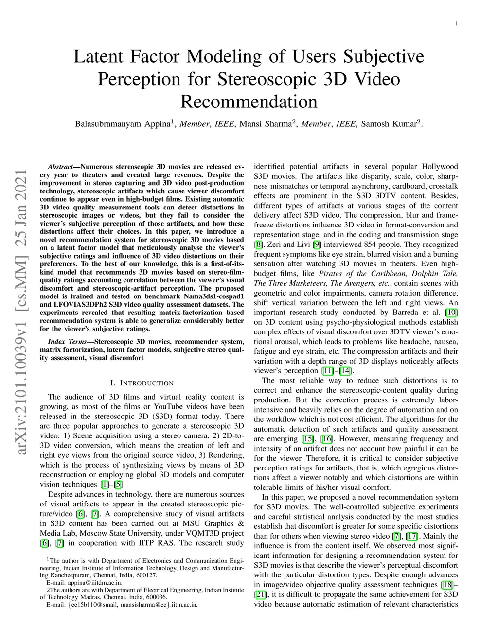 Latent Factor Modeling of Users Subjective Perception for Stereoscopic