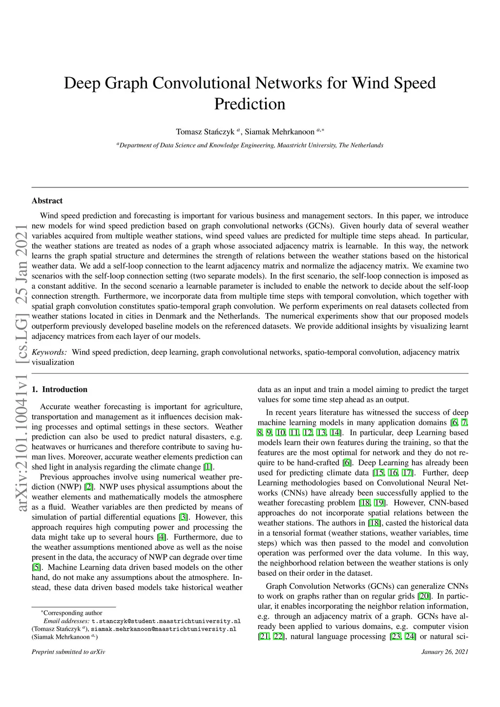 Wind speed prediction and forecasting is important for various business and management sectors. In this paper, we introduce new models for wind speed prediction based on graph convolutional networks (GCNs). Given hourly data of several weather variables acquired from multiple weather stations, wind speed values are predicted for multiple time steps ahead. In particular, the weather stations are treated as nodes of a graph whose associated adjacency matrix is learnable. In this way, the network learns the graph spatial structure and determines the strength of relations between the weather stations based on the historical weather data. We add a self-loop connection to the learnt adjacency matrix and normalize the adjacency matrix. We examine two scenarios with the self-loop connection setting (two separate models). In the first scenario, the self-loop connection is imposed as a constant additive. In the second scenario a learnable parameter is included to enable the network to decide about the self-loop connection strength. Furthermore, we incorporate data from multiple time steps with temporal convolution, which together with spatial graph convolution constitutes spatio-temporal graph convolution. We perform experiments on real datasets collected from weather stations located in cities in Denmark and the Netherlands. The numerical experiments show that our proposed models outperform previously developed baseline models on the referenced datasets. We provide additional insights by visualizing learnt adjacency matrices from each layer of our models.