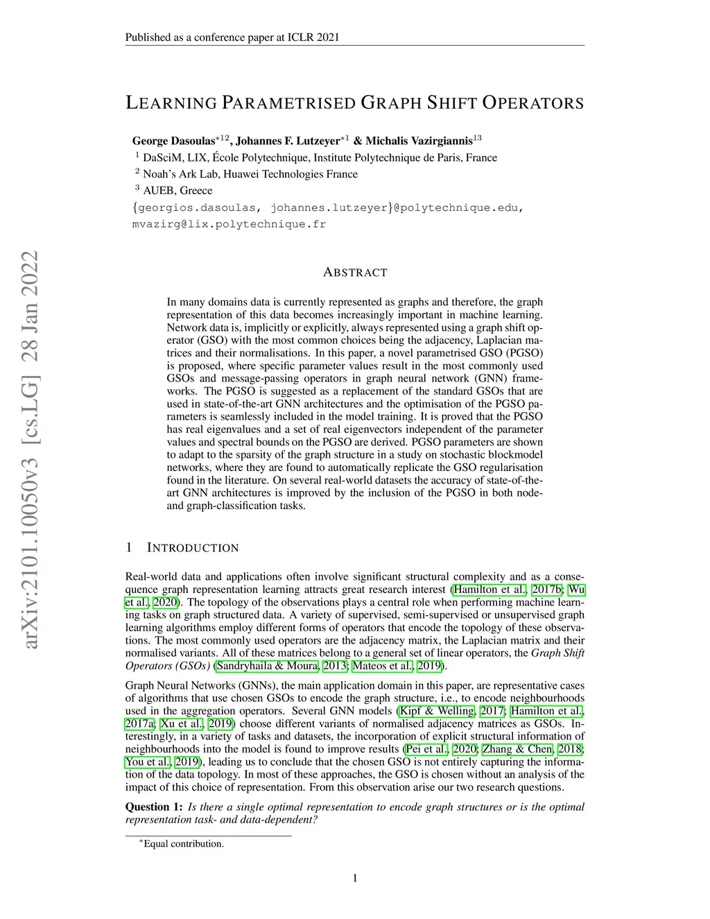 In many domains data is currently represented as graphs and therefore, the graph representation of this data becomes increasingly important in machine learning. Network data is, implicitly or explicitly, always represented using a graph shift operator (GSO) with the most common choices being the adjacency, Laplacian matrices and their normalisations. In this paper, a novel parametrised GSO (PGSO) is proposed, where specific parameter values result in the most commonly used GSOs and message-passing operators in graph neural network (GNN) frameworks. The PGSO is suggested as a replacement of the standard GSOs that are used in state-of-the-art GNN architectures and the optimisation of the PGSO parameters is seamlessly included in the model training. It is proved that the PGSO has real eigenvalues and a set of real eigenvectors independent of the parameter values and spectral bounds on the PGSO are derived. PGSO parameters are shown to adapt to the sparsity of the graph structure in a study on stochastic blockmodel networks, where they are found to automatically replicate the GSO regularisation found in the literature. On several real-world datasets the accuracy of state-of-the-art GNN architectures is improved by the inclusion of the PGSO in both node- and graph-classification tasks.