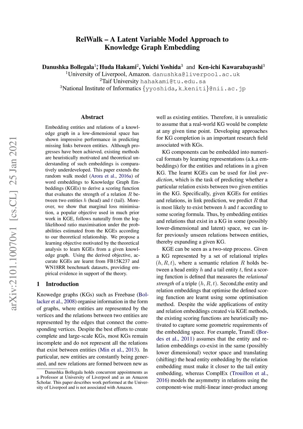 RelWalk A Latent Variable Model Approach to Knowledge Graph Embedding