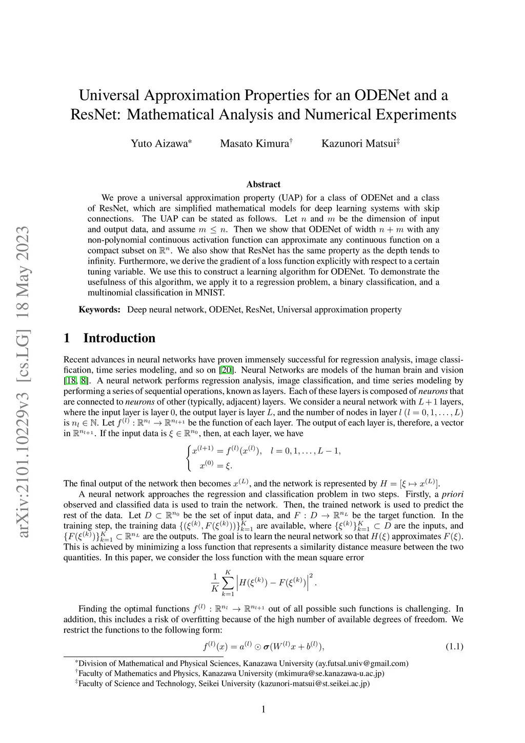 We prove a universal approximation property (UAP) for a class of ODENet and a class of ResNet, which are simplified mathematical models for deep learning systems with skip connections. The UAP can be stated as follows. Let and be the dimension of input and output data, and assume . Then we show that ODENet of width with any non-polynomial continuous activation function can approximate any continuous function on a compact subset on . We also show that ResNet has the same property as the depth tends to infinity. Furthermore, we derive the gradient of a loss function explicitly with respect to a certain tuning variable. We use this to construct a learning algorithm for ODENet. To demonstrate the usefulness of this algorithm, we apply it to a regression problem, a binary classification, and a multinomial classification in MNIST.