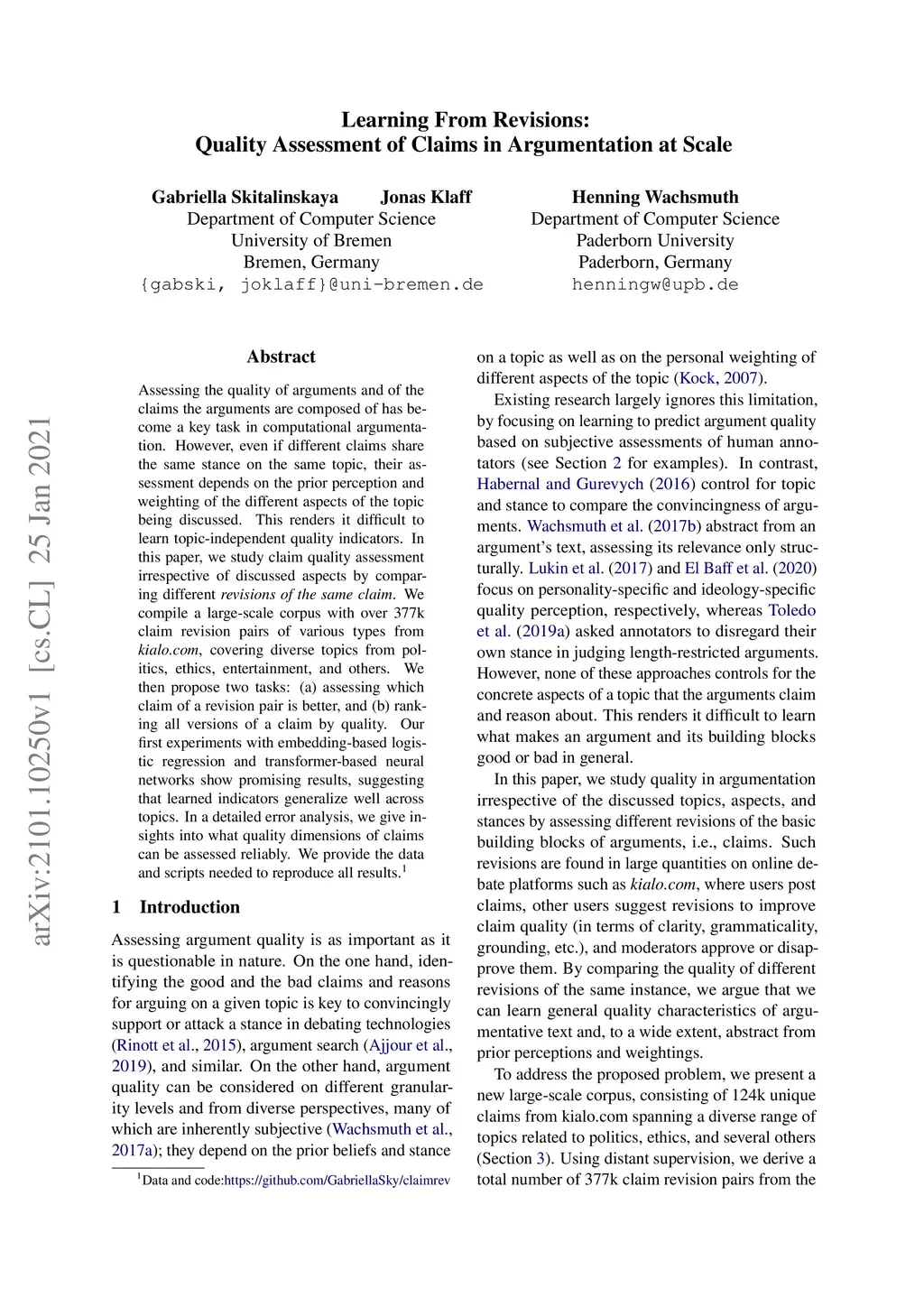 Learning From Revisions: Quality Assessment of Claims in Argumentation