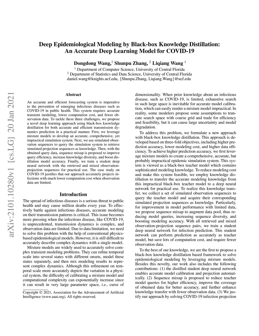 An accurate and efficient forecasting system is imperative to the prevention of emerging infectious diseases such as COVID-19 in public health. This system requires accurate transient modeling, lower computation cost, and fewer observation data. To tackle these three challenges, we propose a novel deep learning approach using black-box knowledge distillation for both accurate and efficient transmission dynamics prediction in a practical manner. First, we leverage mixture models to develop an accurate, comprehensive, yet impractical simulation system. Next, we use simulated observation sequences to query the simulation system to retrieve simulated projection sequences as knowledge. Then, with the obtained query data, sequence mixup is proposed to improve query efficiency, increase knowledge diversity, and boost distillation model accuracy. Finally, we train a student deep neural network with the retrieved and mixed observation-projection sequences for practical use. The case study on COVID-19 justifies that our approach accurately projects infections with much lower computation cost when observation data are limited.