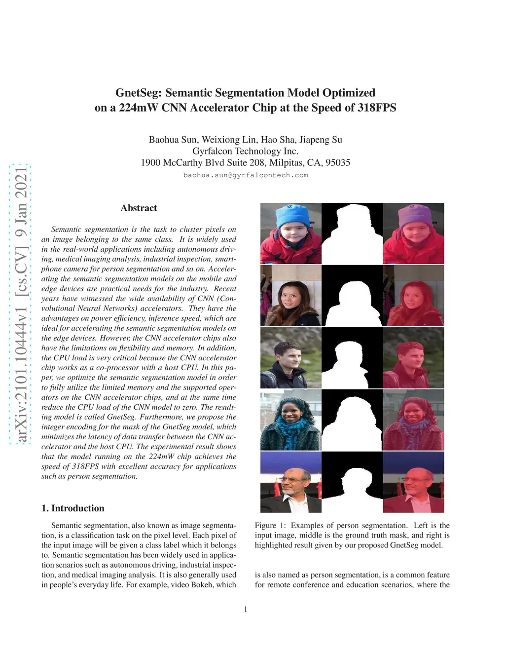 Semantic segmentation is the task to cluster pixels on an image belonging to the same class. It is widely used in the real-world applications including autonomous driving, medical imaging analysis, industrial inspection, smartphone camera for person segmentation and so on. Accelerating the semantic segmentation models on the mobile and edge devices are practical needs for the industry. Recent years have witnessed the wide availability of CNN (Convolutional Neural Networks) accelerators. They have the advantages on power efficiency, inference speed, which are ideal for accelerating the semantic segmentation models on the edge devices. However, the CNN accelerator chips also have the limitations on flexibility and memory. In addition, the CPU load is very critical because the CNN accelerator chip works as a co-processor with a host CPU. In this paper, we optimize the semantic segmentation model in order to fully utilize the limited memory and the supported operators on the CNN accelerator chips, and at the same time reduce the CPU load of the CNN model to zero. The resulting model is called GnetSeg. Furthermore, we propose the integer encoding for the mask of the GnetSeg model, which minimizes the latency of data transfer between the CNN accelerator and the host CPU. The experimental result shows that the model running on the 224mW chip achieves the speed of 318FPS with excellent accuracy for applications such as person segmentation.