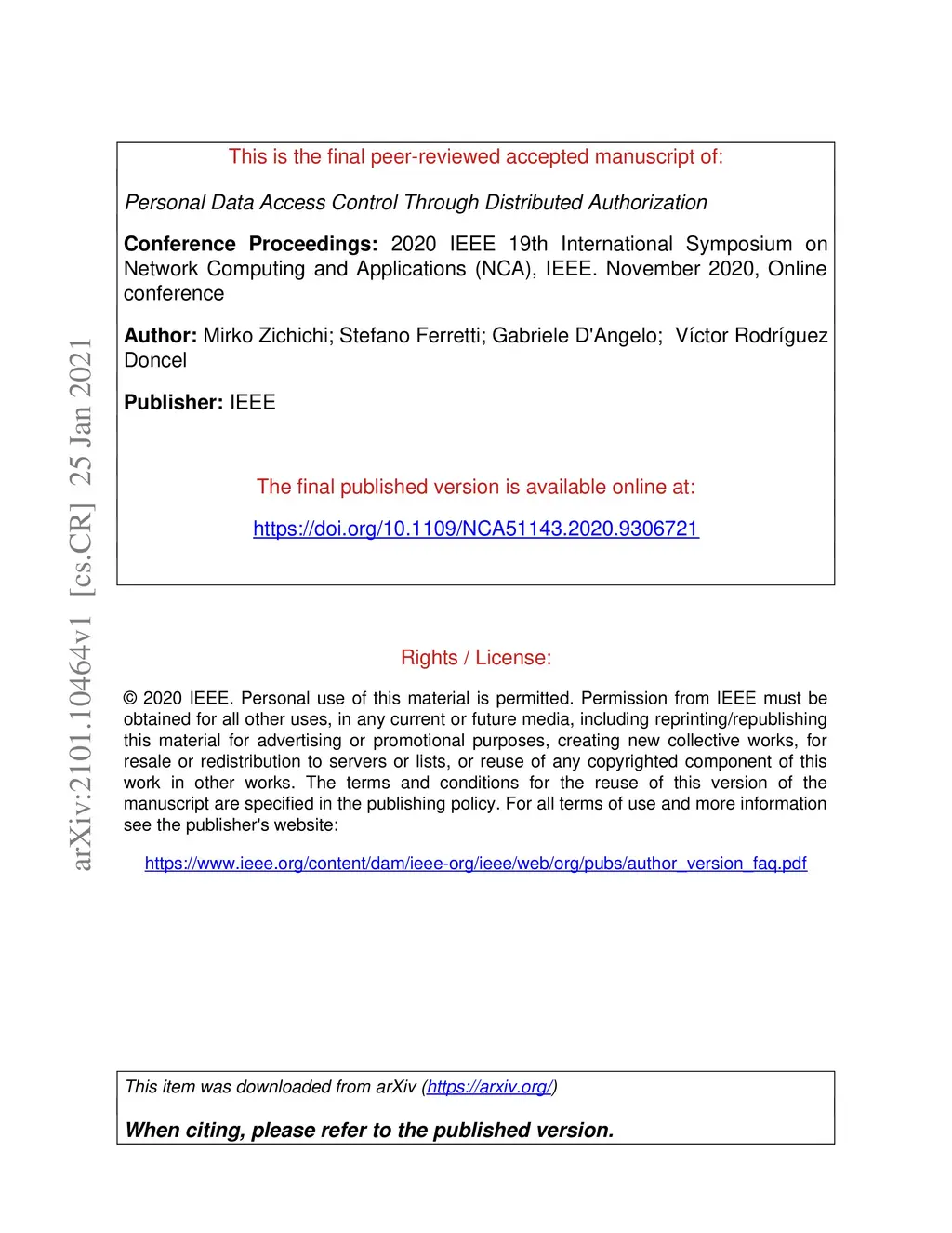 This paper presents an architecture of a Personal Information Management System, in which individuals can define the access to their personal data by means of smart contracts. These smart contracts, running on the Ethereum blockchain, implement access control lists and grant immutability, traceability and verifiability of the references to personal data, which is stored itself in a (possibly distributed) file system. A distributed authorization mechanism is devised, where trust from multiple network nodes is necessary to grant the access to the data. To this aim, two possible alternatives are described: a Secret Sharing scheme and Threshold Proxy Re-Encryption scheme. The performance of these alternatives is experimentally compared in terms of execution time. Threshold Proxy Re-Encryption appears to be faster in different scenarios, in particular when increasing message size, number of nodes and the threshold value, i.e. number of nodes needed to grant the data disclosure.