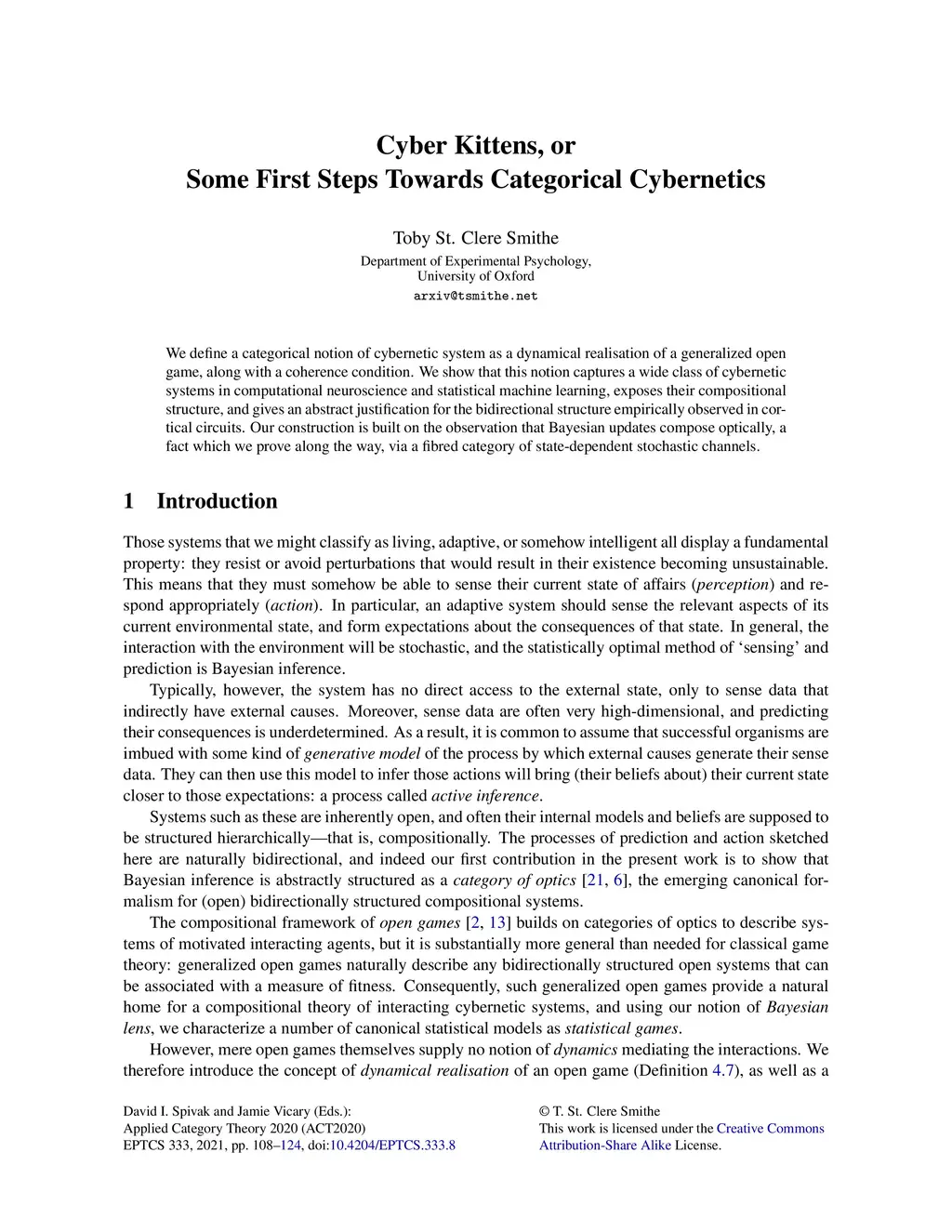 We define a categorical notion of cybernetic system as a dynamical realisation of a generalized open game, along with a coherence condition. We show that this notion captures a wide class of cybernetic systems in computational neuroscience and statistical machine learning, exposes their compositional structure, and gives an abstract justification for the bidirectional structure empirically observed in cortical circuits. Our construction is built on the observation that Bayesian updates compose optically, a fact which we prove along the way, via a fibred category of state-dependent stochastic channels.
