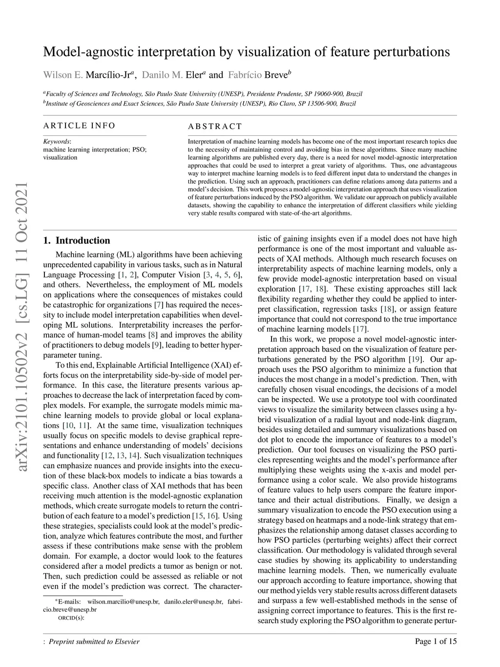 Interpretation of machine learning models has become one of the most important research topics due to the necessity of maintaining control and avoiding bias in these algorithms. Since many machine learning algorithms are published every day, there is a need for novel model-agnostic interpretation approaches that could be used to interpret a great variety of algorithms. Thus, one advantageous way to interpret machine learning models is to feed different input data to understand the changes in the prediction. Using such an approach, practitioners can define relations among data patterns and a model's decision. This work proposes a model-agnostic interpretation approach that uses visualization of feature perturbations induced by the PSO algorithm. We validate our approach on publicly available datasets, showing the capability to enhance the interpretation of different classifiers while yielding very stable results compared with state-of-the-art algorithms.