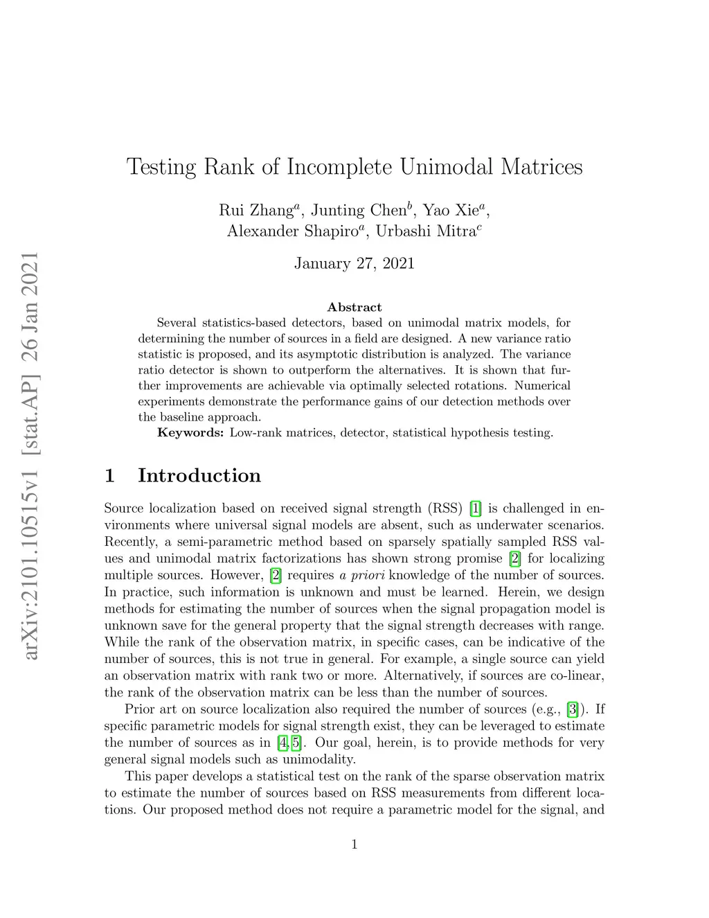 Several statistics-based detectors, based on unimodal matrix models, for determining the number of sources in a field are designed. A new variance ratio statistic is proposed, and its asymptotic distribution is analyzed. The variance ratio detector is shown to outperform the alternatives. It is shown that further improvements are achievable via optimally selected rotations. Numerical experiments demonstrate the performance gains of our detection methods over the baseline approach.