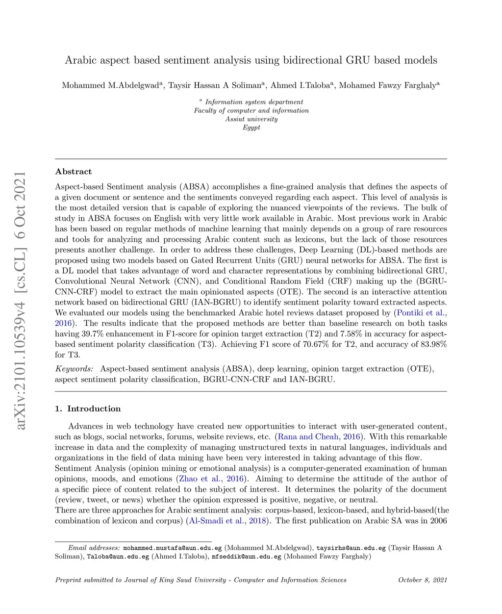 Arabic aspect based sentiment analysis using bidirectional GRU based
