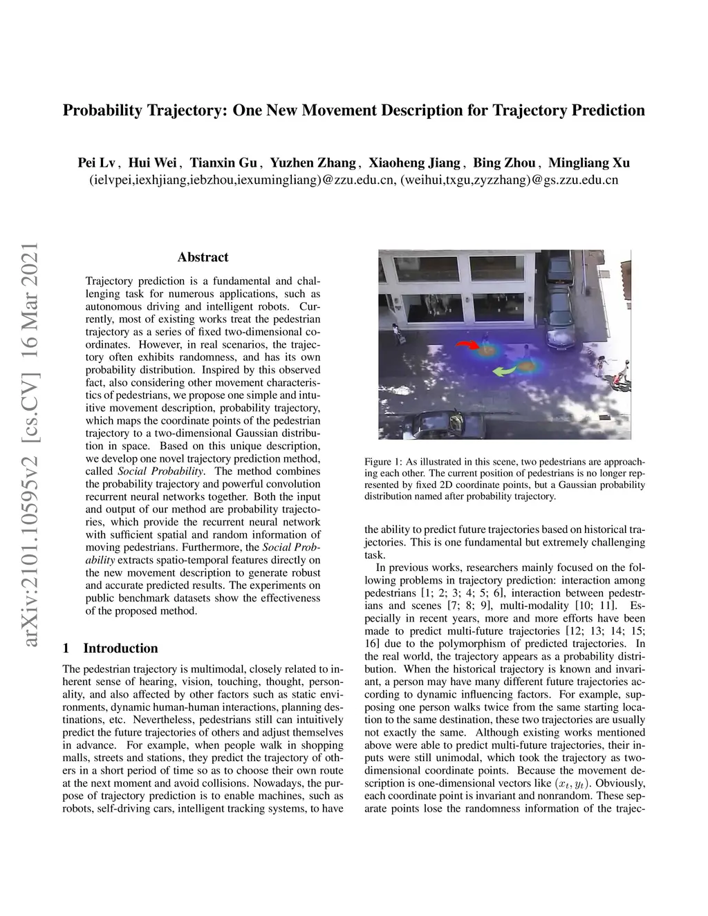 Trajectory prediction is a fundamental and challenging task for numerous applications, such as autonomous driving and intelligent robots. Currently, most of existing work treat the pedestrian trajectory as a series of fixed two-dimensional coordinates. However, in real scenarios, the trajectory often exhibits randomness, and has its own probability distribution. Inspired by this observed fact, also considering other movement characteristics of pedestrians, we propose one simple and intuitive movement description, probability trajectory, which maps the coordinate points of pedestrian trajectory into two-dimensional Gaussian distribution in images. Based on this unique description, we develop one novel trajectory prediction method, called social probability. The method combines the new probability trajectory and powerful convolution recurrent neural networks together. Both the input and output of our method are probability trajectories, which provide the recurrent neural network with sufficient spatial and random information of moving pedestrians. And the social probability extracts spatio-temporal features directly on the new movement description to generate robust and accurate predicted results. The experiments on public benchmark datasets show the effectiveness of the proposed method.
