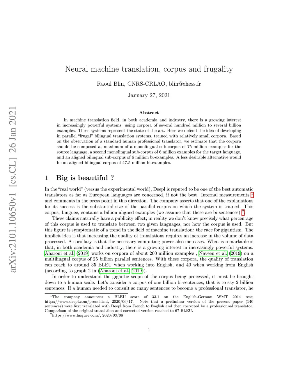 Neural machine translation, corpus and frugality