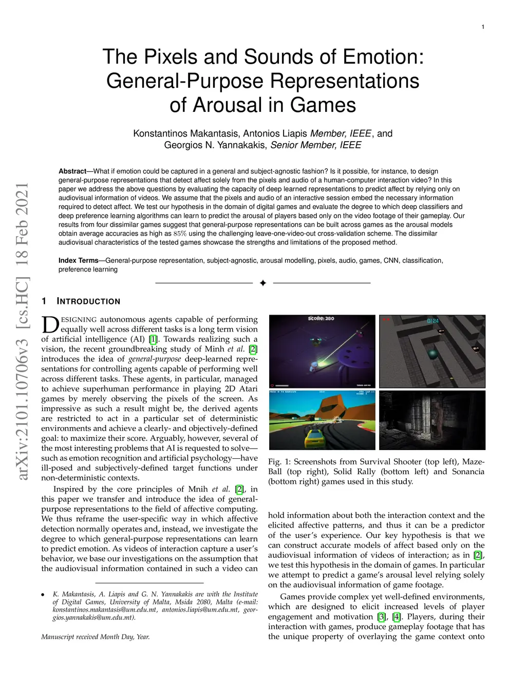 What if emotion could be captured in a general and subject-agnostic fashion? Is it possible, for instance, to design general-purpose representations that detect affect solely from the pixels and audio of a human-computer interaction video? In this paper we address the above questions by evaluating the capacity of deep learned representations to predict affect by relying only on audiovisual information of videos. We assume that the pixels and audio of an interactive session embed the necessary information required to detect affect. We test our hypothesis in the domain of digital games and evaluate the degree to which deep classifiers and deep preference learning algorithms can learn to predict the arousal of players based only on the video footage of their gameplay. Our results from four dissimilar games suggest that general-purpose representations can be built across games as the arousal models obtain average accuracies as high as 85% using the challenging leave-one-video-out cross-validation scheme. The dissimilar audiovisual characteristics of the tested games showcase the strengths and limitations of the proposed method.