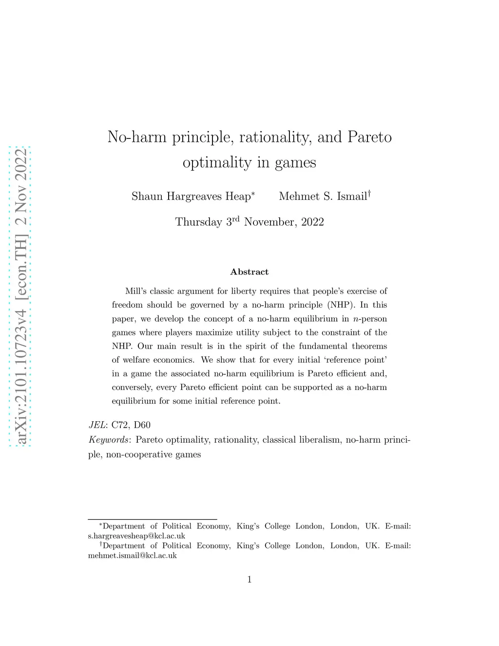 Mill's classic argument for liberty requires that people's exercise of freedom should be governed by a no-harm principle (NHP). In this paper, we develop the concept of a no-harm equilibrium in -person games where players maximize utility subject to the constraint of the NHP. Our main result is in the spirit of the fundamental theorems of welfare economics. We show that for every initial `reference point' in a game the associated no-harm equilibrium is Pareto efficient and, conversely, every Pareto efficient point can be supported as a no-harm equilibrium for some initial reference point.
