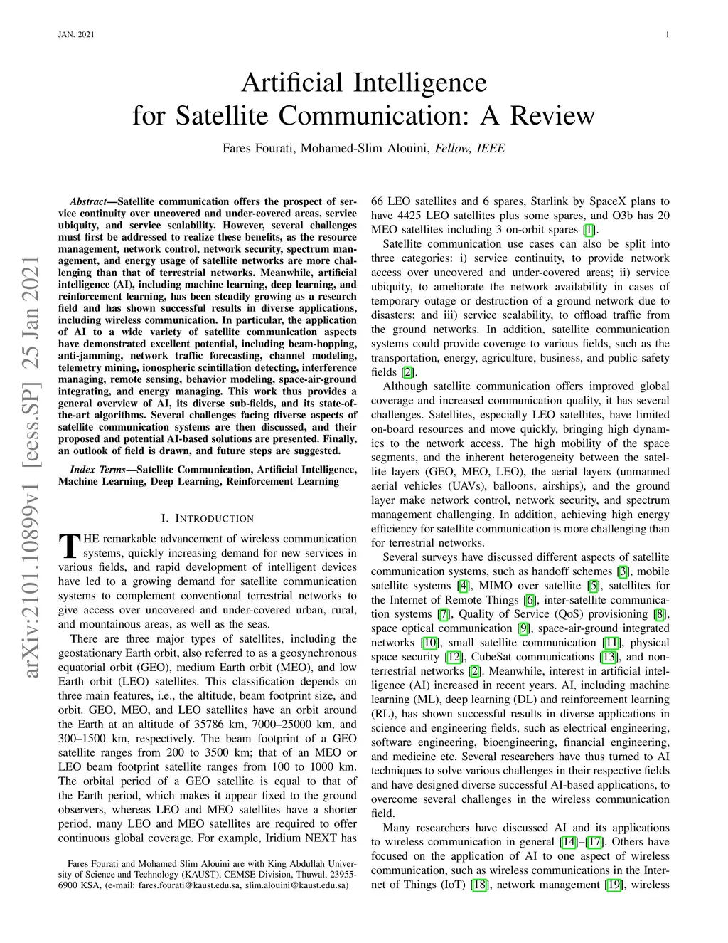 Satellite communication offers the prospect of service continuity over uncovered and under-covered areas, service ubiquity, and service scalability. However, several challenges must first be addressed to realize these benefits, as the resource management, network control, network security, spectrum management, and energy usage of satellite networks are more challenging than that of terrestrial networks. Meanwhile, artificial intelligence (AI), including machine learning, deep learning, and reinforcement learning, has been steadily growing as a research field and has shown successful results in diverse applications, including wireless communication. In particular, the application of AI to a wide variety of satellite communication aspects have demonstrated excellent potential, including beam-hopping, anti-jamming, network traffic forecasting, channel modeling, telemetry mining, ionospheric scintillation detecting, interference managing, remote sensing, behavior modeling, space-air-ground integrating, and energy managing. This work thus provides a general overview of AI, its diverse sub-fields, and its state-of-the-art algorithms. Several challenges facing diverse aspects of satellite communication systems are then discussed, and their proposed and potential AI-based solutions are presented. Finally, an outlook of field is drawn, and future steps are suggested.
