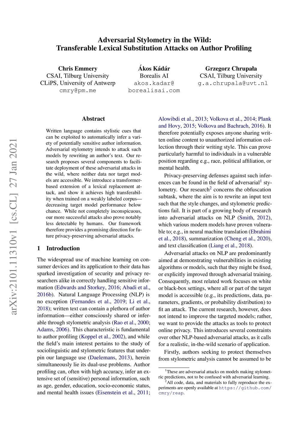 Written language contains stylistic cues that can be exploited to automatically infer a variety of potentially sensitive author information. Adversarial stylometry intends to attack such models by rewriting an author's text. Our research proposes several components to facilitate deployment of these adversarial attacks in the wild, where neither data nor target models are accessible. We introduce a transformer-based extension of a lexical replacement attack, and show it achieves high transferability when trained on a weakly labeled corpus -- decreasing target model performance below chance. While not completely inconspicuous, our more successful attacks also prove notably less detectable by humans. Our framework therefore provides a promising direction for future privacy-preserving adversarial attacks.