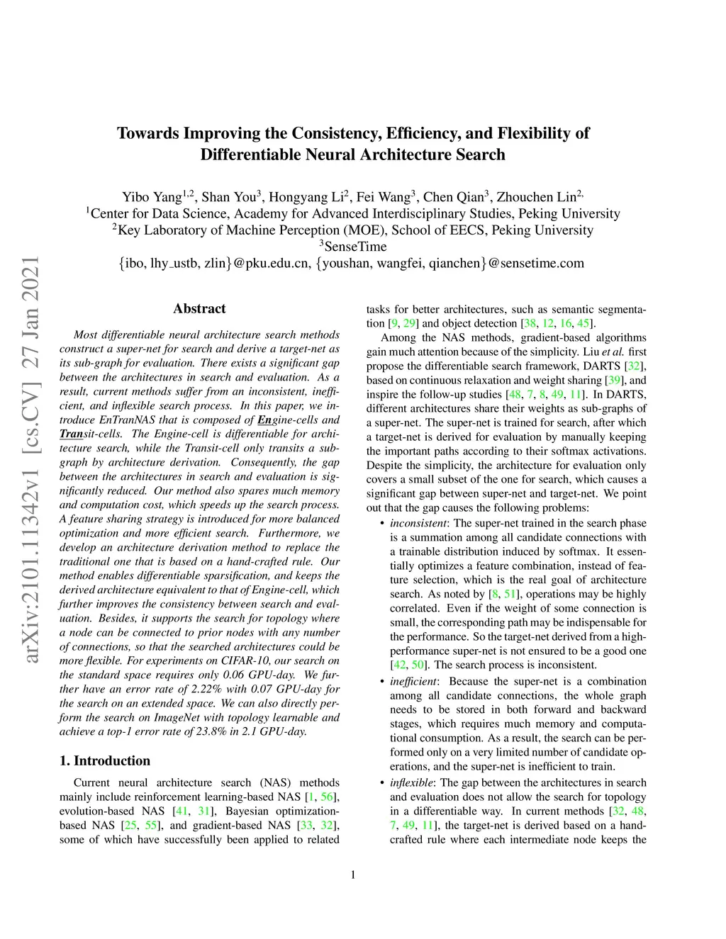 Most differentiable neural architecture search methods construct a super-net for search and derive a target-net as its sub-graph for evaluation. There exists a significant gap between the architectures in search and evaluation. As a result, current methods suffer from an inconsistent, inefficient, and inflexible search process. In this paper, we introduce EnTranNAS that is composed of Engine-cells and Transit-cells. The Engine-cell is differentiable for architecture search, while the Transit-cell only transits a sub-graph by architecture derivation. Consequently, the gap between the architectures in search and evaluation is significantly reduced. Our method also spares much memory and computation cost, which speeds up the search process. A feature sharing strategy is introduced for more balanced optimization and more efficient search. Furthermore, we develop an architecture derivation method to replace the traditional one that is based on a hand-crafted rule. Our method enables differentiable sparsification, and keeps the derived architecture equivalent to that of Engine-cell, which further improves the consistency between search and evaluation. Besides, it supports the search for topology where a node can be connected to prior nodes with any number of connections, so that the searched architectures could be more flexible. For experiments on CIFAR-10, our search on the standard space requires only 0.06 GPU-day. We further have an error rate of 2.22% with 0.07 GPU-day for the search on an extended space. We can also directly perform the search on ImageNet with topology learnable and achieve a top-1 error rate of 23.8% in 2.1 GPU-day.