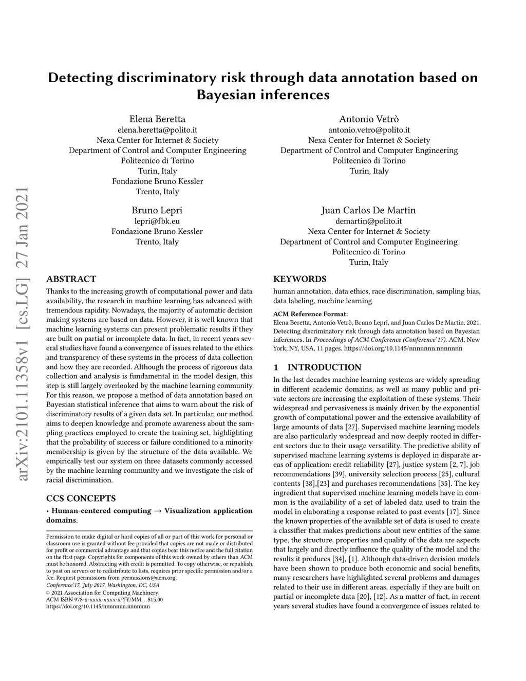 Detecting discriminatory risk through data annotation based on Bayesian