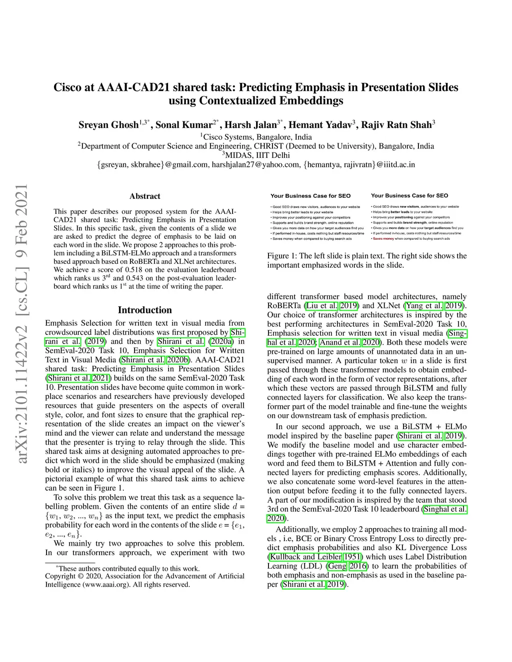 Cisco at AAAI-CAD21 shared task: Predicting Emphasis in Presentation