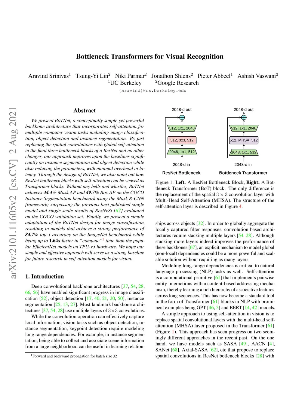 We present BoTNet, a conceptually simple yet powerful backbone architecture that incorporates self-attention for multiple computer vision tasks including image classification, object detection and instance segmentation. By just replacing the spatial convolutions with global self-attention in the final three bottleneck blocks of a ResNet and no other changes, our approach improves upon the baselines significantly on instance segmentation and object detection while also reducing the parameters, with minimal overhead in latency. Through the design of BoTNet, we also point out how ResNet bottleneck blocks with self-attention can be viewed as Transformer blocks. Without any bells and whistles, BoTNet achieves 44.4% Mask AP and 49.7% Box AP on the COCO Instance Segmentation benchmark using the Mask R-CNN framework; surpassing the previous best published single model and single scale results of ResNeSt evaluated on the COCO validation set. Finally, we present a simple adaptation of the BoTNet design for image classification, resulting in models that achieve a strong performance of 84.7% top-1 accuracy on the ImageNet benchmark while being up to 1.64x faster in compute time than the popular EfficientNet models on TPU-v3 hardware. We hope our simple and effective approach will serve as a strong baseline for future research in self-attention models for vision