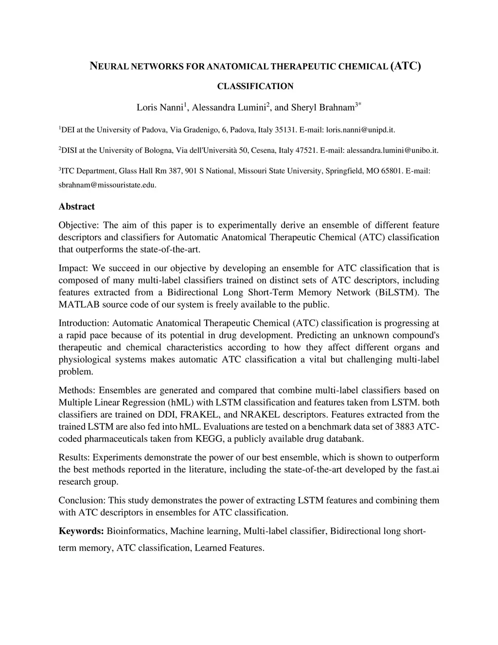 Motivation: Automatic Anatomical Therapeutic Chemical (ATC) classification is a critical and highly competitive area of research in bioinformatics because of its potential for expediting drug develop-ment and research. Predicting an unknown compound's therapeutic and chemical characteristics ac-cording to how these characteristics affect multiple organs/systems makes automatic ATC classifica-tion a challenging multi-label problem. Results: In this work, we propose combining multiple multi-label classifiers trained on distinct sets of features, including sets extracted from a Bidirectional Long Short-Term Memory Network (BiLSTM). Experiments demonstrate the power of this approach, which is shown to outperform the best methods reported in the literature, including the state-of-the-art developed by the fast.ai research group. Availability: All source code developed for this study is available at https://github.com/LorisNanni. Contact: loris.nanni@unipd.it
