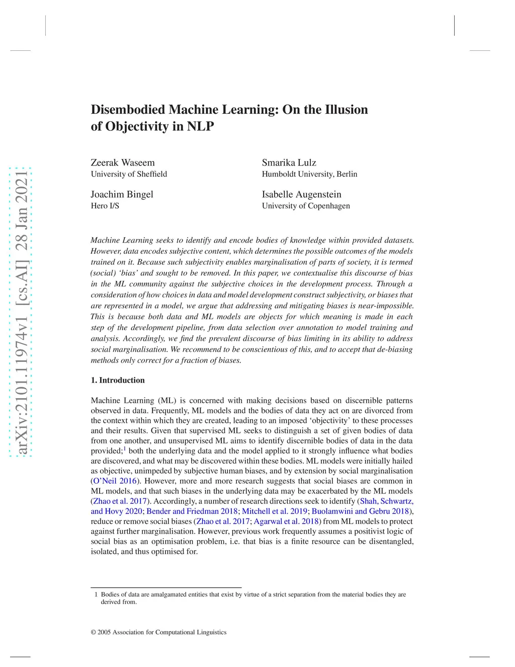 Disembodied Machine Learning: On the Illusion of Objectivity in NLP