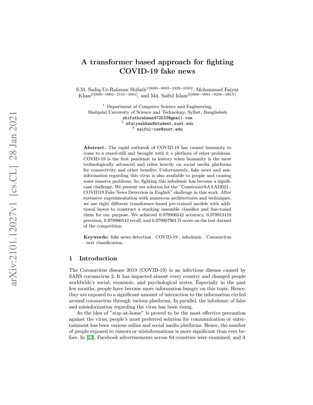 The rapid outbreak of COVID-19 has caused humanity to come to a stand-still and brought with it a plethora of other problems. COVID-19 is the first pandemic in history when humanity is the most technologically advanced and relies heavily on social media platforms for connectivity and other benefits. Unfortunately, fake news and misinformation regarding this virus is also available to people and causing some massive problems. So, fighting this infodemic has become a significant challenge. We present our solution for the "Constraint@AAAI2021 - COVID19 Fake News Detection in English" challenge in this work. After extensive experimentation with numerous architectures and techniques, we use eight different transformer-based pre-trained models with additional layers to construct a stacking ensemble classifier and fine-tuned them for our purpose. We achieved 0.979906542 accuracy, 0.979913119 precision, 0.979906542 recall, and 0.979907901 f1-score on the test dataset of the competition.