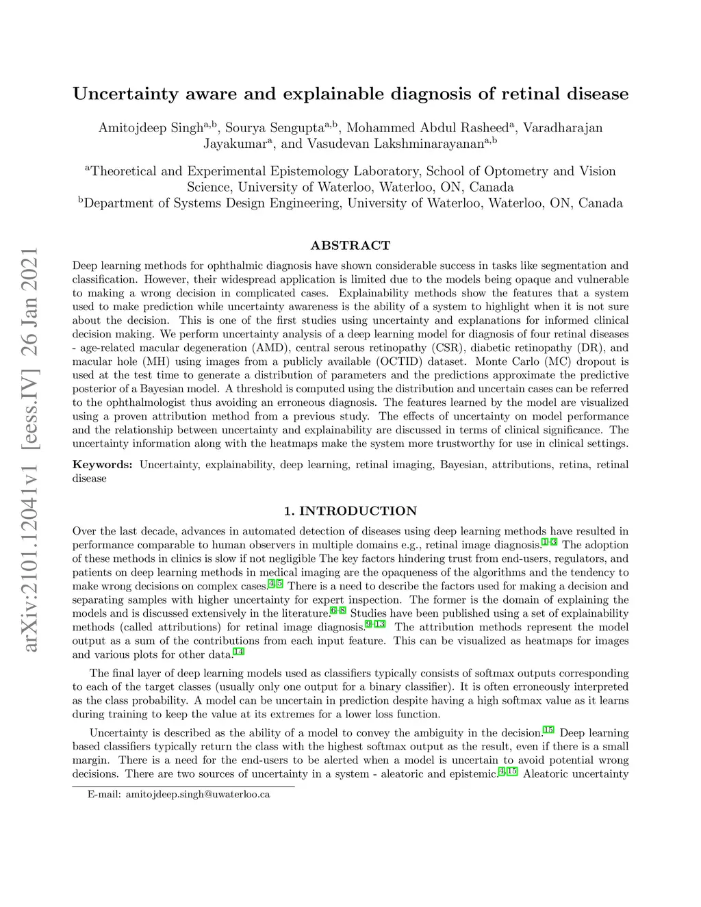 Deep learning methods for ophthalmic diagnosis have shown considerable success in tasks like segmentation and classification. However, their widespread application is limited due to the models being opaque and vulnerable to making a wrong decision in complicated cases. Explainability methods show the features that a system used to make prediction while uncertainty awareness is the ability of a system to highlight when it is not sure about the decision. This is one of the first studies using uncertainty and explanations for informed clinical decision making. We perform uncertainty analysis of a deep learning model for diagnosis of four retinal diseases - age-related macular degeneration (AMD), central serous retinopathy (CSR), diabetic retinopathy (DR), and macular hole (MH) using images from a publicly available (OCTID) dataset. Monte Carlo (MC) dropout is used at the test time to generate a distribution of parameters and the predictions approximate the predictive posterior of a Bayesian model. A threshold is computed using the distribution and uncertain cases can be referred to the ophthalmologist thus avoiding an erroneous diagnosis. The features learned by the model are visualized using a proven attribution method from a previous study. The effects of uncertainty on model performance and the relationship between uncertainty and explainability are discussed in terms of clinical significance. The uncertainty information along with the heatmaps make the system more trustworthy for use in clinical settings.