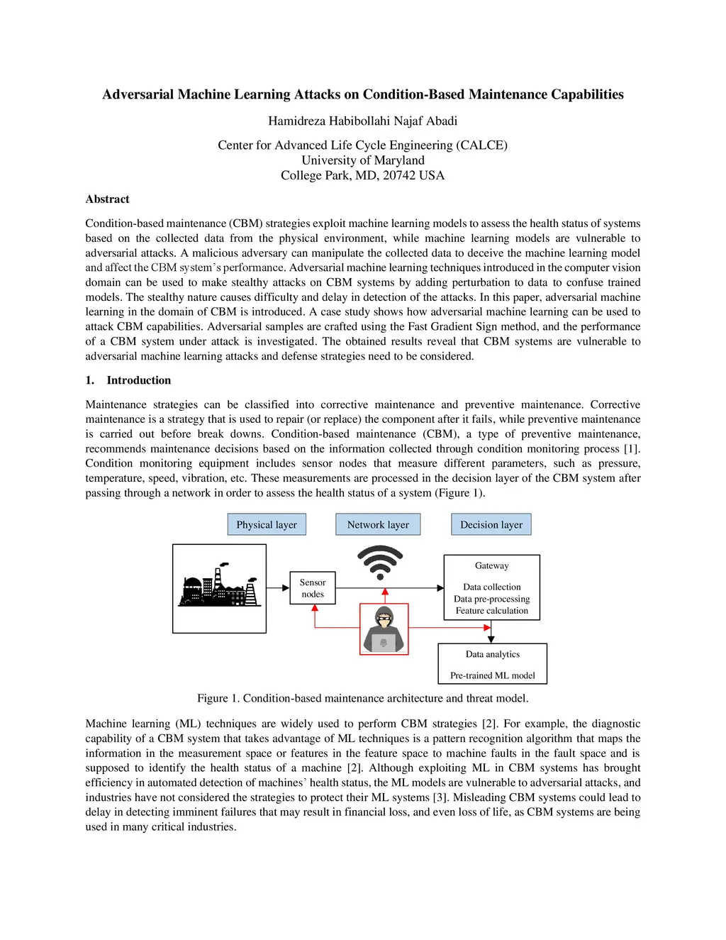 Condition-based maintenance (CBM) strategies exploit machine learning models to assess the health status of systems based on the collected data from the physical environment, while machine learning models are vulnerable to adversarial attacks. A malicious adversary can manipulate the collected data to deceive the machine learning model and affect the CBM system's performance. Adversarial machine learning techniques introduced in the computer vision domain can be used to make stealthy attacks on CBM systems by adding perturbation to data to confuse trained models. The stealthy nature causes difficulty and delay in detection of the attacks. In this paper, adversarial machine learning in the domain of CBM is introduced. A case study shows how adversarial machine learning can be used to attack CBM capabilities. Adversarial samples are crafted using the Fast Gradient Sign method, and the performance of a CBM system under attack is investigated. The obtained results reveal that CBM systems are vulnerable to adversarial machine learning attacks and defense strategies need to be considered.