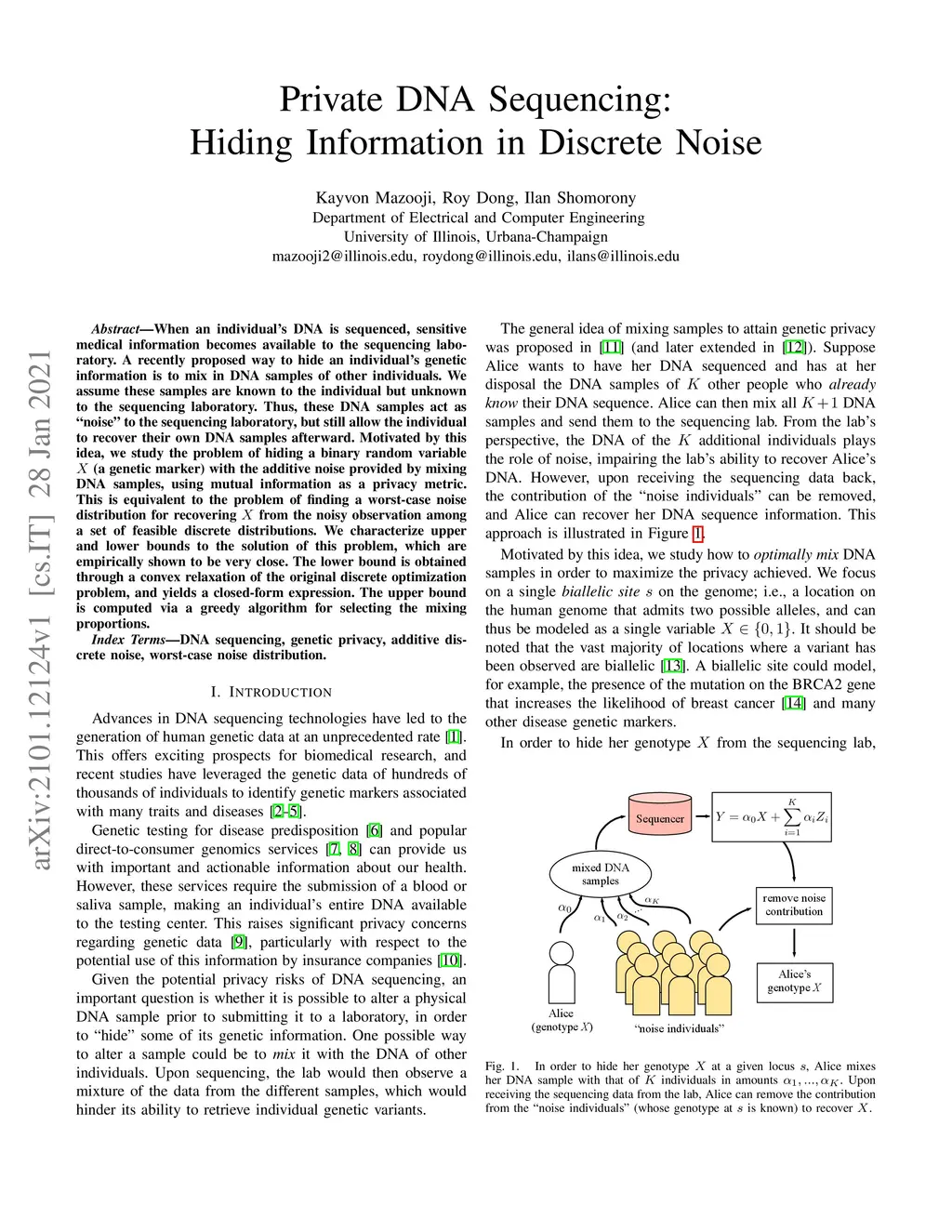 When an individual's DNA is sequenced, sensitive medical information becomes available to the sequencing laboratory. A recently proposed way to hide an individual's genetic information is to mix in DNA samples of other individuals. We assume these samples are known to the individual but unknown to the sequencing laboratory. Thus, these DNA samples act as "noise" to the sequencing laboratory, but still allow the individual to recover their own DNA samples afterward. Motivated by this idea, we study the problem of hiding a binary random variable X (a genetic marker) with the additive noise provided by mixing DNA samples, using mutual information as a privacy metric. This is equivalent to the problem of finding a worst-case noise distribution for recovering X from the noisy observation among a set of feasible discrete distributions. We characterize upper and lower bounds to the solution of this problem, which are empirically shown to be very close. The lower bound is obtained through a convex relaxation of the original discrete optimization problem, and yields a closed-form expression. The upper bound is computed via a greedy algorithm for selecting the mixing proportions.