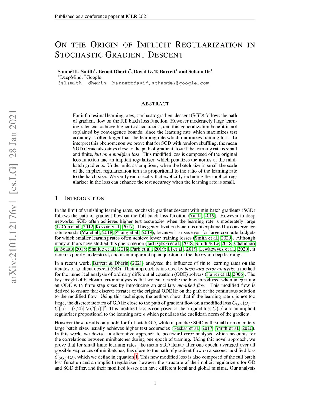 For infinitesimal learning rates, stochastic gradient descent (SGD) follows the path of gradient flow on the full batch loss function. However moderately large learning rates can achieve higher test accuracies, and this generalization benefit is not explained by convergence bounds, since the learning rate which maximizes test accuracy is often larger than the learning rate which minimizes training loss. To interpret this phenomenon we prove that for SGD with random shuffling, the mean SGD iterate also stays close to the path of gradient flow if the learning rate is small and finite, but on a modified loss. This modified loss is composed of the original loss function and an implicit regularizer, which penalizes the norms of the minibatch gradients. Under mild assumptions, when the batch size is small the scale of the implicit regularization term is proportional to the ratio of the learning rate to the batch size. We verify empirically that explicitly including the implicit regularizer in the loss can enhance the test accuracy when the learning rate is small.